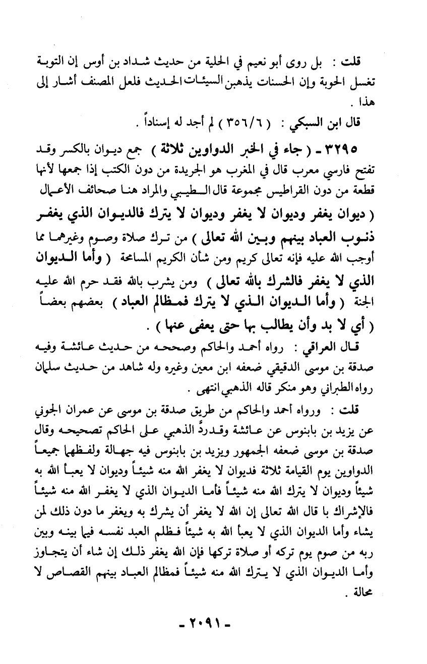 قلت: ورواه أحمد والحاكم من طريق صدقة بن موسى عن عمران الجوني عن يزيد بن بابنوس عن عائشة وقد ردَّ الذهبي على الحاكم تصحيحه وقال صدقة بن موسى ضعفه الجمهور ويزيد بن بابنوس فيه جهالة ولفظهما جميعاً الدواوين يوم القيامة ثلاثة فديوان لا يغفر الله منه شيئاً وديوان لا يعبأ الله به شيئاً وديوان لا يترك الله منه شيئاً فأما الديوان الذي لا يغفر الله منه شيئاً فالإشراك با قال الله تعالى إن الله لا يغفر أن يشرك به ويغفر ما دون ذلك لمن يشاء وأما الديوان الذي لا يعبأ الله به شيئاً فظلم العبد نفسه فيما بينه وبين ربه من صوم يوم تركه أو صلاة تركها فإن الله يغفر ذلك إن شاء أن يتجاوز وأما الديوان الذي لا يترك الله منه شيئاً فمظالم العباد بينهم القصاص لا محالة.