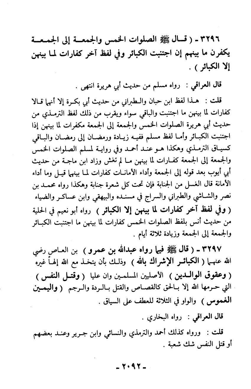 3296 - (قال - صلّى الله عليه وسلم - الصلوات الخمس والجمعة إلى الجمعة يكفرن ما بينهم إن اجتنبت الكبائر وفي لفظ أخر كفارات لما بينهن إلا الكبائر).