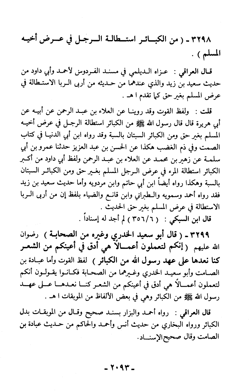 3298 - (من الكبائر استطالة الرجل في عرض أخيه المسلم).