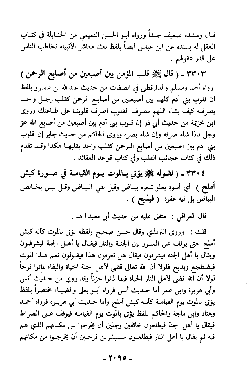 3303 - (قال - صلّى الله عليه وسلم - قلب المؤمن بين أصبعين من أصابع الرحمن) رواه أحمد ومسلم والدارقطني في الصفات من حديث عبد الله بن عمرو بلفظ أن قلوب بني آدم كلها بين أصبعين من أصابع الرحمن كقلب رجل واحد يصرفه كيف يشاء اللهم مصرف القلوب اصرف قلوبنا على طاعتك وروى ابن خزيمة من حديث أبي ذر إن قلوب بني آدم بين أصبعين من أصابع الله عز وجل فإذا شاء صرفه وإن شاء بصره وروى الحاكم من حديث جابر إن قلوب بني آدم بين أصبعين من أصابع الرحمن كقلب واحد يقلبها هكذا وقد تقدم ذلك في كتاب عجائب القلب وفي كتاب قواعد العقائد.
