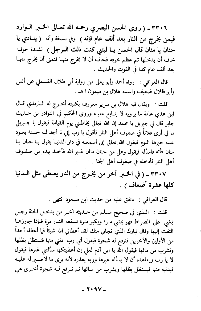 3356 - (روى الحسن البصري رحمه الله تعالى الخبر الوارد فيمن يخرج من النار بعد ألف عام فإنه) وفي نسخة وأنه (ينادي يا حنان يا منان قال الحسن يا ليتني كنت ذلك الرجل) لشدة خوفه خاف أن يدخلها ثم عظم خوفه فخاف أن لا يخرج منها فتمنى أن يخرج منها بعد ألف عام كذا في القوت والحديث.