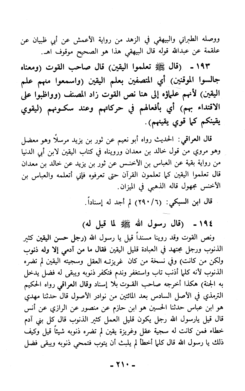 193 - (قال - صلى الله عليه وسلم - تعلموا اليقين) قال صاحب القوت (ومعناه جالسوا الموقنين) أي المتصفين بعلم اليقين (واسمعوا منهم علم اليقين) لأنهم علماؤه إلى هنا نص القوت زاد المصنف (وواظبوا على الاقتداء بهم) أي بأفعالهم في حركاتهم وعند سكونهم (ليقوي يقينكم كما قوي يقينهم).
