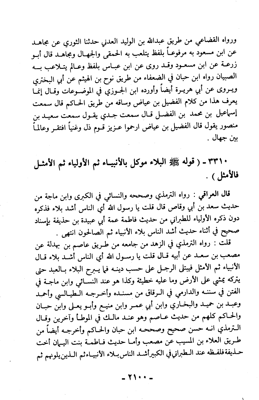 3310 - (قوله - صلّى الله عليه وسلم - البلاء موكل بالأنبياء ثم الأولياء ثم الأمثل فالأمثل).