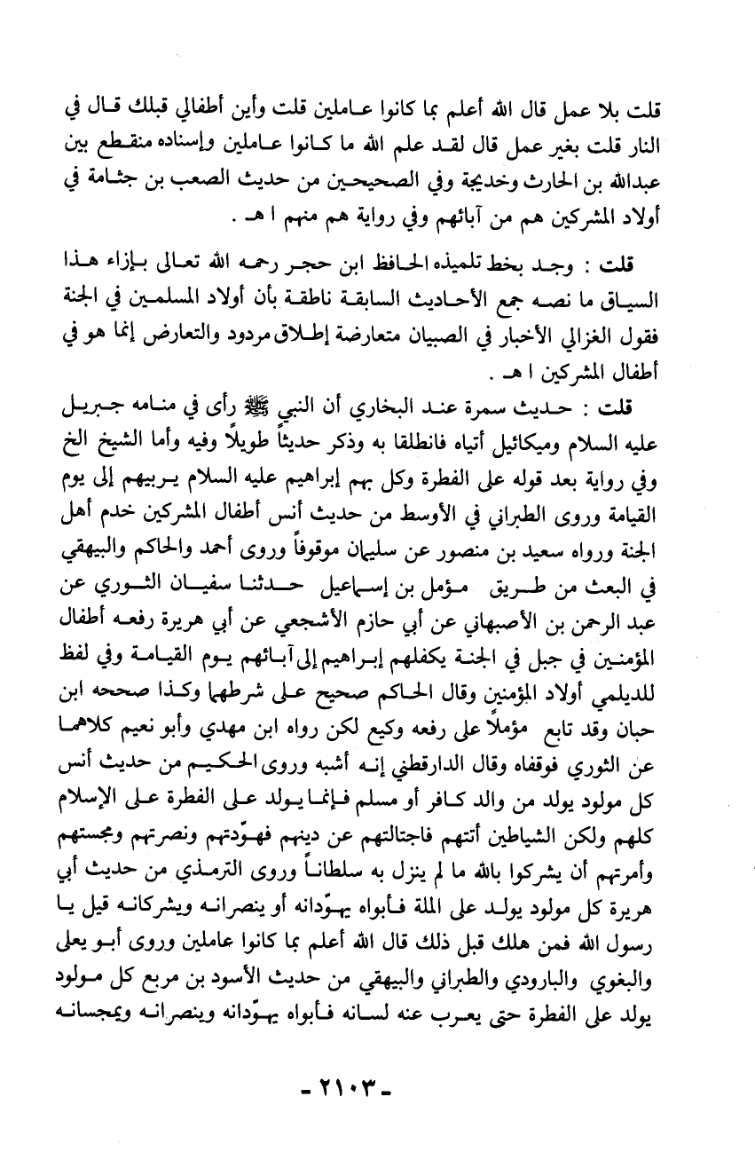 قلت: وجد بخط تلميذه الحافظ ابن حجر رحمه الله تعالى بإزاء هذا السياق ما نصه جمع الأحاديث السابقة ناطقة بأن أولاد المسلمين في الجنة فقول الغزالي الأخبار في الصبيان متعارضة إطلاق مردود والتعارض إنما هو في أطفال المشركين اهـ.