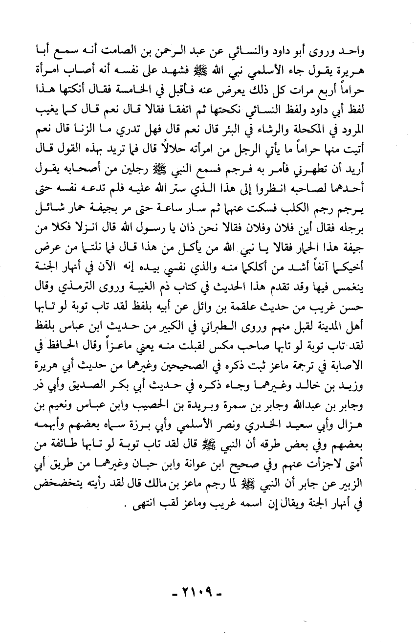 واحد وروى أبو داود والنسائي عن عبد الرحمن بن الصامت أنه سمع أبا هريرة يقول جاء الأسلمي نبي الله - صلّى الله عليه وسلم - فشهد على نفسه أنه أصاب امرأة حراماً أربع مرات كل ذلك يعرض عنه فأقبل في الخامسة فقال أنكتها هذا لفظ أبي داود ولفظ النسائي نكحتها ثم اتفقا فقالا قال نعم قال كما يغيب المرود في المكحلة والرشاء في البئر قال نعم قال فهل تدري ما الزنا قال نعم أتيت منها حراماً ما يأتي الرجل من امرأته حلالاً قال فما تريد بهذه القول قال أريد أن تطهرني فأمر به فرجم فسمع النبي - صلّى الله عليه وسلم - رجلين من أصحابه يقول أحدهما لصاحبه انظروا إلى هذا الذي ستر الله عليه فلم تدعه نفسه حتى يرجم رجم الكلب فسكت عنهما ثم سار ساعة حتى مر بجيفة حمار شائل برجله فقال أين فلان وفلان فقالا نحن ذان يا رسول الله قال انزلا فكلا من جيفة هذا الحمار فقالا يا نبي الله من يأكل من هذا قال فما نلتما من عرض أخيكما آنفاً أشد من أكلكما منه والذي نفسي بيده إنه الآن في أنهار الجنة ينغمس فيها وقد تقدم هذا الحديث في كتاب ذم الغيبة وروى الترمذي وقال حسن غريب من حديث علقمة بن وائل عن أبيه بلفظ لقد تاب توبة لو تابها أهل المدينة لقبل منهم وروى الطبراني في الكبير من حديث ابن عباس بلفظ لقد تاب توبة لو تابها صاحب مكس لقبلت منه يعني ماعزاً وقال الحافظ في الإصابة في ترجمة ماعز ثبت ذكره في الصحيحين وغيرهما من حديث أبي هريرة وزيد بن خالد وغيرهما وجاء ذكره في حديث أبي بكر الصديق وأبي ذر وجابر بن عبد الله وجابر بن سمرة وبريدة بن الحصيب وابن عباس ونعيم بن هزال وأبي سعيد الخدري ونصر الأسلمي وأبي برزة سماه بعضهم وأبهمه بعضهم وفي بعض طرقه أن النبي - صلّى الله عليه وسلم - قال لقد تاب توبة لو تابها طائفة من أمتى لأجزأت عنهم وفي صحيح ابن عوانة وابن حبان وغيرهما من طريق أبي الزبير عن جابر أن النبي - صلّى الله عليه وسلم - لما رجم ماعز بن مالك قال لقد رأيته يتخضخض في أنهار الجنة ويقاك إن اسمه غريب وماعز لقب انتهى.