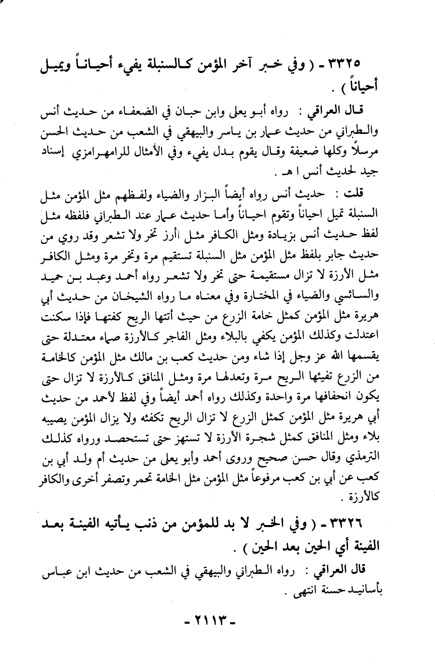 3325 - (وفي خبر آخر المؤمن كالسنبلة يفيء أحياناً ويميل أحياناً).