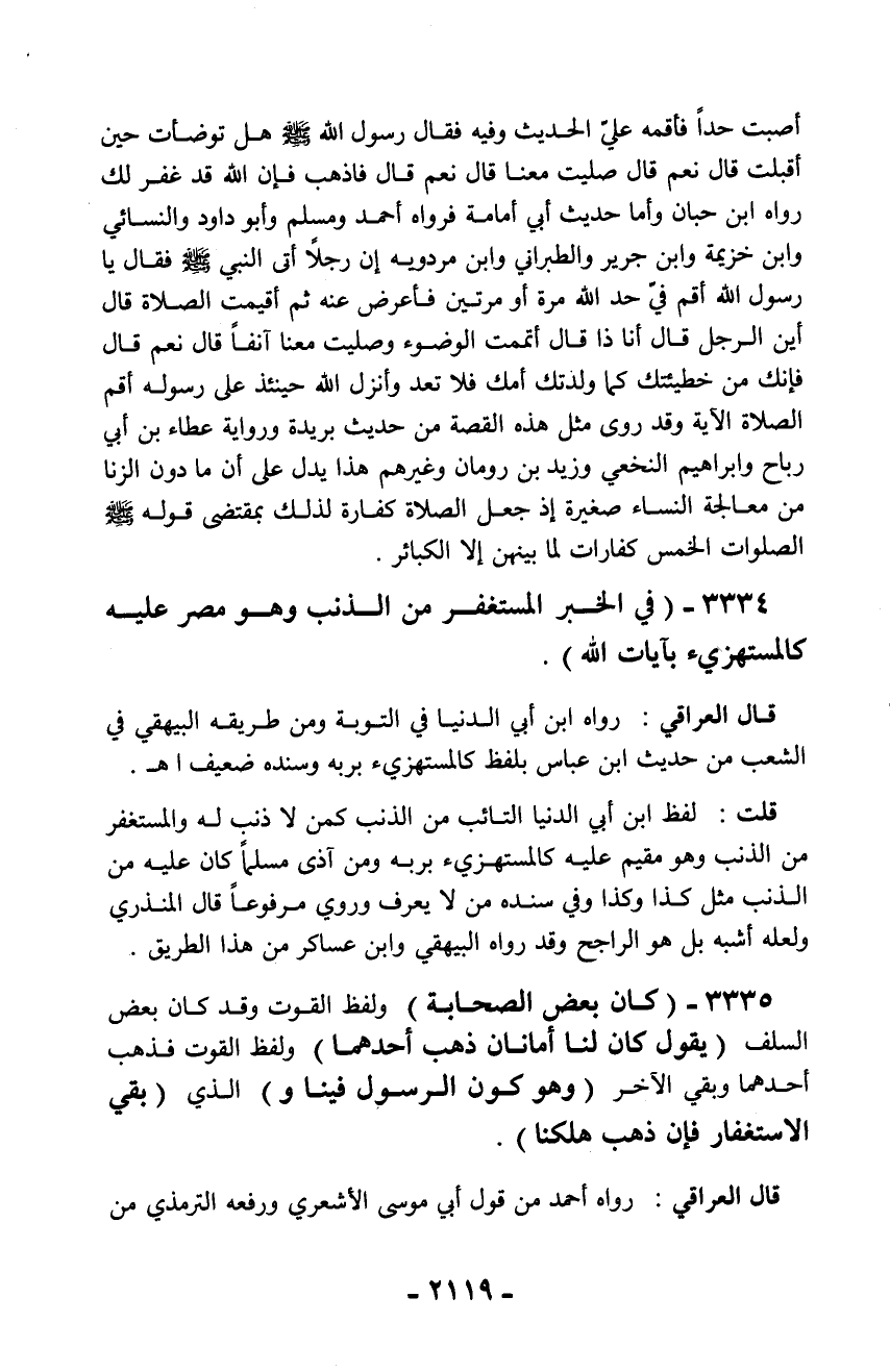 أصبت حداً فأقمه عليّ الحديث وفيه فقال رسول الله - صلّى الله عليه وسلم - هل توضأت حين أقبلت قال نعم قال صليت معنا قال نعم قال فاذهب فإن الله قد غفر لك رواه ابن حبان وأما حديث أبي أمامة فرواه أحمد ومسلم وأبو داود والنسائي وابن خزيمة وابن جرير والطبراني وابن مردويه إن رجلاً أتى النبي - صلّى الله عليه وسلم - فقال يا رسول الله أقم فيّ حد الله مرة أو مرتين فأعرض عنه ثم أقيمت الصلاة قال أين الرجل قال أنا ذا قال أتممت الوضوء وصليت معنا آنفاً قال نعم قال فإنك من خطيئتك كما ولدتك أمك فلا تعد وأنزل الله حينئذ على رسوله أقم الصلاة الآية وقد روى مثل هذه القصة من حديث بريدة ورواية عطاء بن أبي رباح وإبراهيم النخعي وزيد بن رومان وغيرهم هذا يدل على أن ما دون الزنا من معالجة النساء صغيرة إذ جعل الصلاة كفارة لذلك بمقتضى قوله - صلّى الله عليه وسلم - الصلوات الخمس كفارات لما بينهن إلا الكبائر.