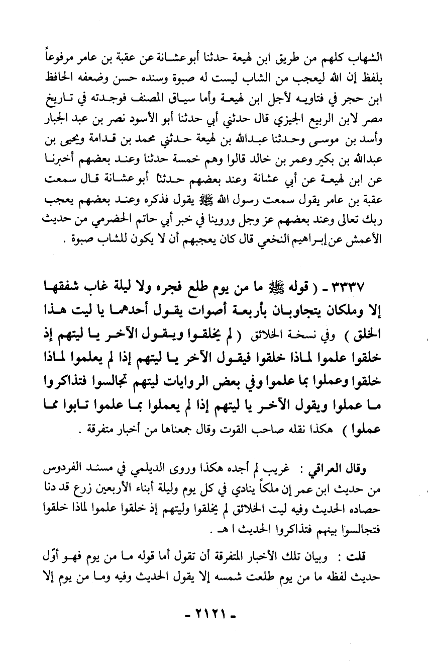 الشهاب كلهم من طريق ابن لهيعة حدثنا أبو عشانة عن عقبة بن عامر مرفوعاً بلفظ إن الله ليعجب من الشاب ليست له صبوة وسنده حسن وضعفه الحافظ ابن حجر في فتاويه لأجل ابن لهيعة وأما سياق المصنف فوجدته في تاريخ مصر لابن الربيع الجيزي قال حدثني أبي حدثنا أبو الأسود نصر بن عبد الجبار وأسد بن موسى وحدثنا عبد الله بن لهيعة حدثني محمد بن قدامة ويحيى بن عبد الله بن بكير وعمر بن خالد قالوا وهم خمسة حدثنا وعند بعضهم أخبرنا عن ابن لهيعة عن أبي عشانة وعند بعضهم حدثنا أبوعشانة قال سمعت عقبة بن عامر يقول سمعت رسول الله - صلّى الله عليه وسلم - يقول فذكره وعند بعضهم يعجب ربك تعالى وعند بعضهم عز وجل وروينا في خبر أبي حاتم الحضرمي من حديث الأعمش عن إبراهيم النخعي قال كان يعجبهم أن لا يكون للشاب صبوة.