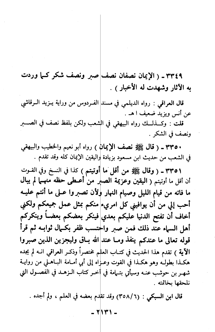3349 - (الإيمان نصفان نصف صبر ونصف شكر كما وردت به الآثار وشهدت له الأخبار).