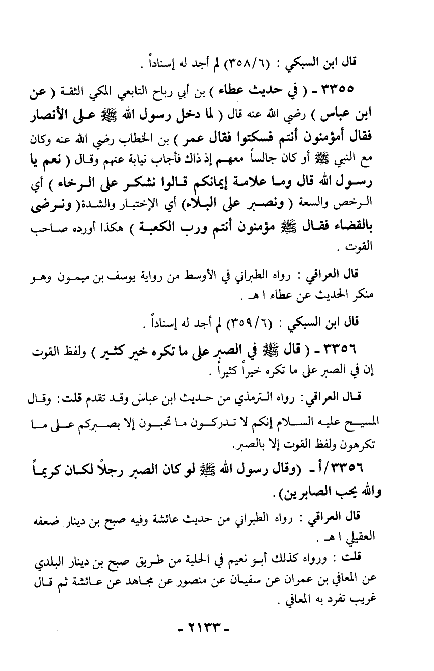 3355 - (في حديث عطاء) بن أبي رباح التابعي المكي الثقة (عن ابن عباس) رضي الله عنه قال (لما دخل رسول الله - صلّى الله عليه وسلم - على الأنصار فقال أمؤمنون أنتم فسكتوا فقال عمر) بن الخطاب رضي الله عنه وكان مع النبي - صلّى الله عليه وسلم - أو كان جالساً معهم إذ ذاك فأجاب نيابة عنهم وقال (نعم يا رسول الله قال وما علامة إيمانكم قالوا نشكر على الرخاء) أي الرخص والسعة (ونصبر على البلاء) أي الاختبار والشدة (ونرضى بالقضاء فقال - صلّى الله عليه وسلم - مؤمنون أنتم ورب الكعبة) هكذا أورده صاحب القوت.