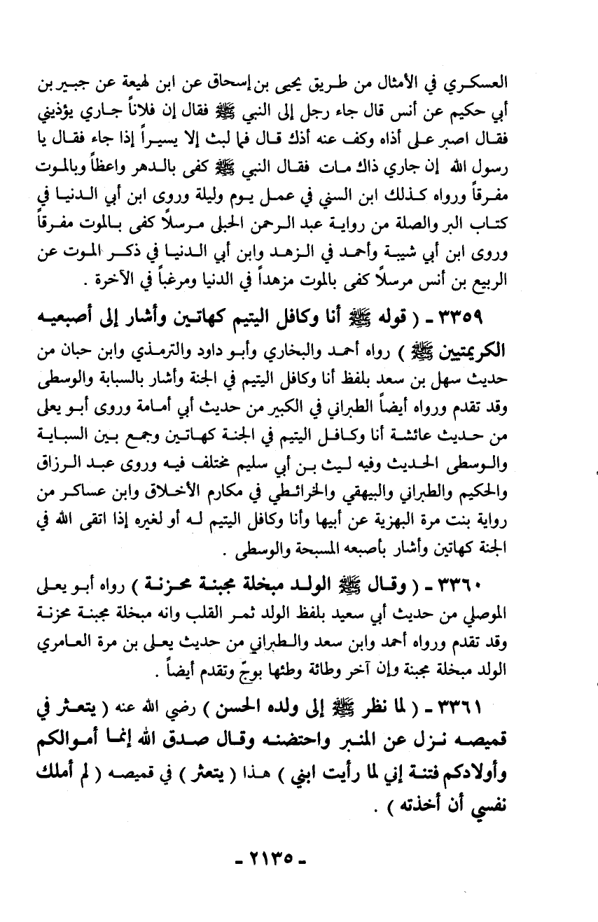 3359 - (قوله - صلّى الله عليه وسلم - أنا وكافل اليتيم كهاتين وأشار إلى أصبعيه الكريمتيين - صلّى الله عليه وسلم -) رواه أحمد والبخاري وأبو داود والترمذي وابن حبان من حديث سهل بن سعد بلفظ أنا وكافل اليتيم في الجنة وأشار بالسبابة والوسطى وقد تقدم ورواه أيضاً الطبراني في الكبير من حديث أبي أمامة وروى أبو يعلى من حديث عائشة أنا وكافل اليتيم في الجنة كهاتين وجمع بين السبابة والوسطى الحديث وفيه ليث بن أبي سليم مختلف فيه وروى عبد الرزاق والحكيم والطبراني والبيهقي والخرائطي في مكارم الأخلاق وابن عساكر من رواية بنت مرة البهزية عن أبيها وأنا وكافل اليتيم له أو لغيره إذا اتقى الله في الجنة كهاتين وأشار بأصبعه المسبحة والوسطى.