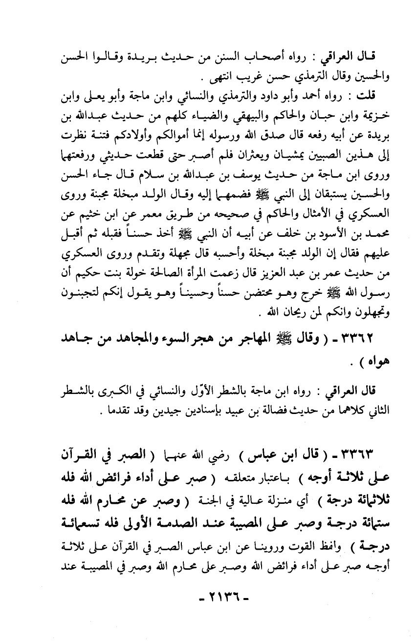 3363 - (قال ابن عباس) رضي الله عنهما (الصبر في القرآن على ثلاثة أوجه) باعتبار متعلقه (صبر على أداء فرائض الله فله ثلاثمائة درجة) أي منزلة عالية في الجنة (وصبر عن محارم الله فله ستمائة درجة وصبر على المصيبة عند الصدمة الأولى فله تسعمائة درجة) ولفظ القوت وروينا عن ابن عباس الصبر في القرآن على ثلاثة أوجه صبر على أداء فرائض الله وصبر على محارم الله وصبر في المصيبة عند
