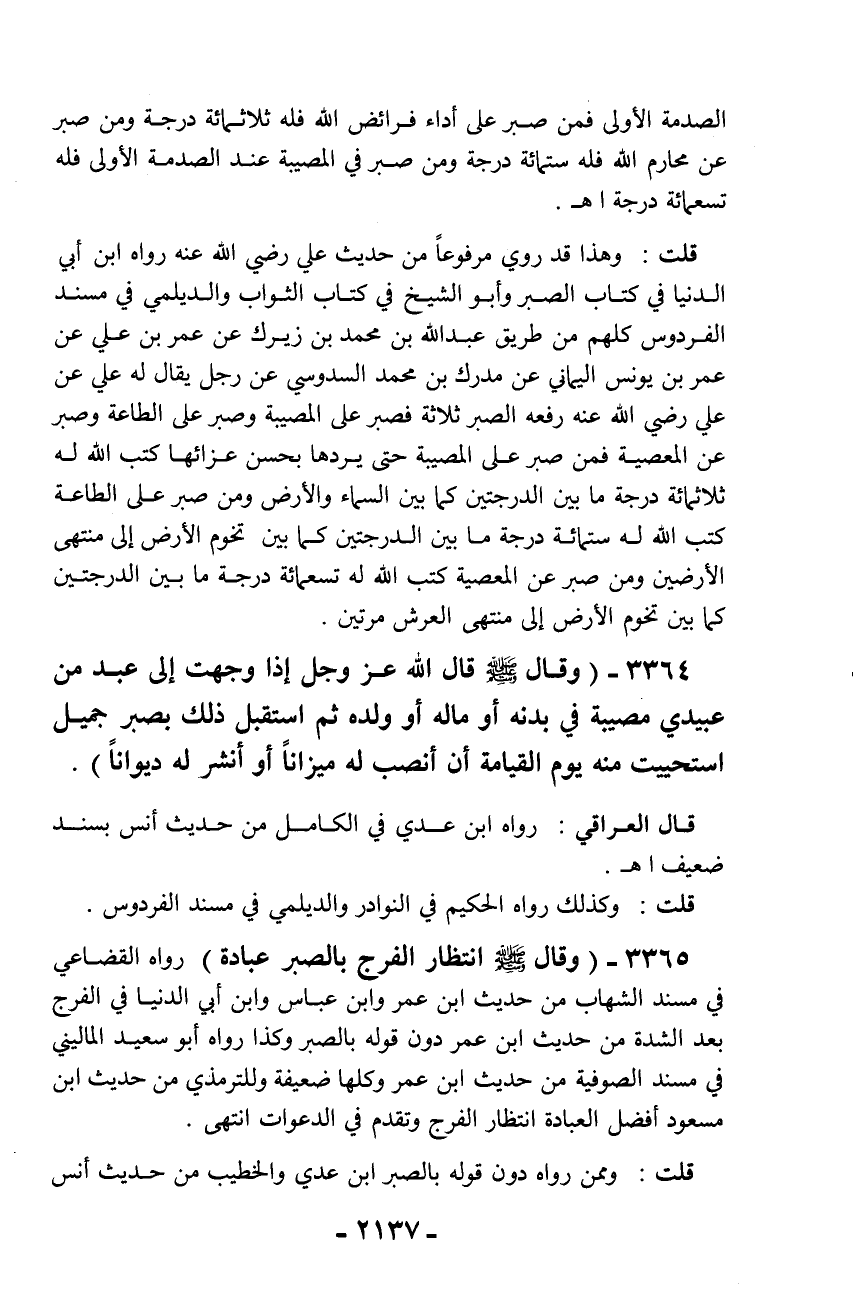 3365 - (وقال - صلّى الله عليه وسلم - انتظار الفرج بالصبر عبادة) رواه القضاعي في مسند الشهاب من حديث ابن عمر وابن عباس وابن أبي الدنيا في الفرج بعد الشدة من حديث ابن عمر دون قوله بالصبر وكذا رواه أبو سعيد الماليني في مسند الصوفية من حديث ابن عمر وكلها ضعيفة وللترمذي من حديث ابن مسعود أفضل العبادة انتظار الفرج وتقدم في الدعوات انتهى.