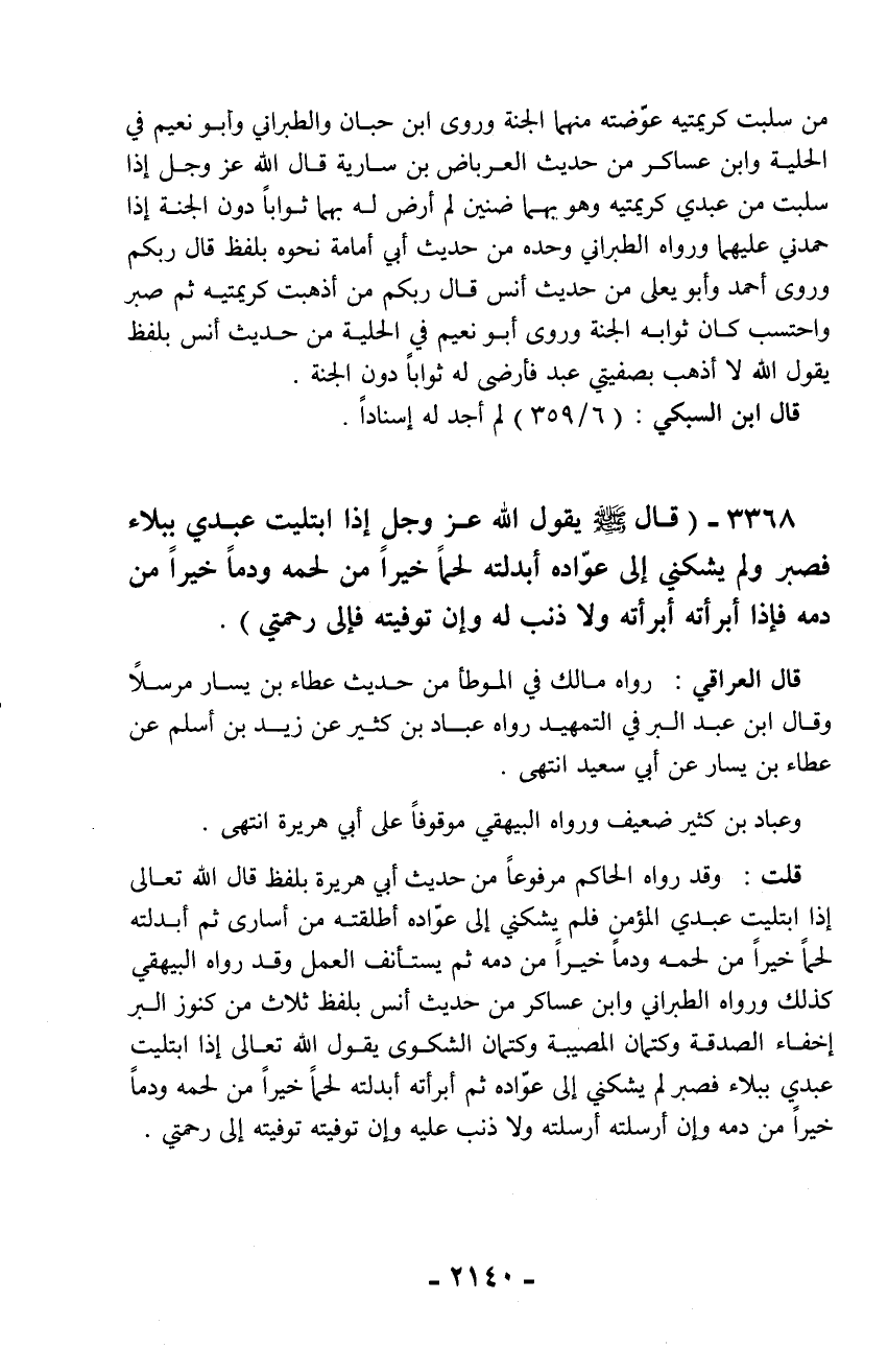 3368 - (قال - صلّى الله عليه وسلم - يقول الله عز وجل إذا ابتليت عبدي ببلاء فصبر ولم يشكني إلى عوّاده أبدلته لحماً خيراً من لحمه ودماً خيراً من دمه فإذا أبرأته أبرأته ولا ذنب له وإن توفيته فإلى رحمتي).