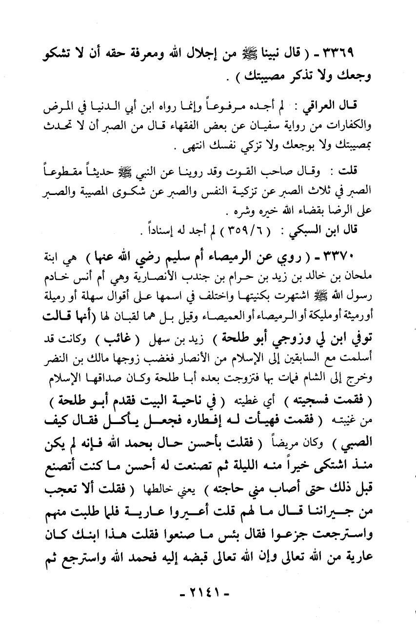 3370 - (روي عن الرميصاء أم سليم رضي الله عنها) هي ابنة ملحان بن خالد بن زيد بن حرام بن جندب الأنصارية وهي أم أنس خادم رسول الله - صلّى الله عليه وسلم - اشتهرت بكنيتها واختلف في اسمها على أقوال سهلة أو رميلة أو رميثة أو مليكة أو الرميصاء أو العميصاء وقيل بل هما لقبان لها (أنها قالت توفي ابن لي وزوجي أبو طلحة) زيد بن سهل (غائب) وكانت قد أسلمت مع السابقين إلى الإسلام من الأنصار فغضب زوجها مالك بن النضر وخرج إلى الشام فمات بها فتزوجت بعده أبا طلحة وكان صداقها الإسلام (فقمت فسجيته) أي غطيته (في ناحية البيت فقدم أبو طلحة) من غيبته (فقمت فهيأت له إفطاره فجعل يأكل فقال كيف الصبي) وكان مريضاً (فقلت بأحسن حال بحمد الله فإنه لم يكن منذ اشتكى خيراً منه الليلة ثم تصنعت له أحسن ما كنت أتصنع قبل ذلك حتى أصاب مني حاجته) يعني خالطها (فقلت ألا تعجب من جيراننا قال ما لهم قلت أعيروا عارية فلما طلبت منهم واسترجعت جزعوا فقال بئس ما صنعوا فقلت هذا ابنك كان عارية من الله تعالى وإن الله تعالى قبضه إليه فحمد الله واسترجع ثم