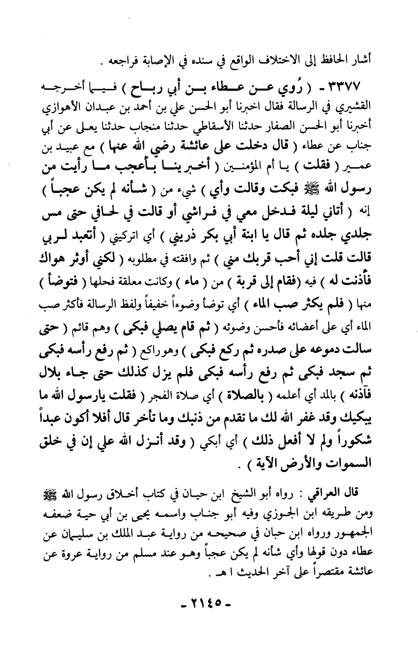 3377 - (رُوي عن عطاء بن أبي رباح) فيما أخرجه القشيري في الرسالة فقال أخبرنا أبو الحسن علي بن أحمد بن عبدان الأهوازي أخبرنا أبو الحسن الصفار حدثنا الأسقاطي حدثنا منجاب حدثنا يعلى عن أبي جناب عن عطاء (قال دخلت على عائشة رضي الله عنها) مع عبيد بن عمير (فقلت) يا أم المؤمنين (أخبرينا بأعجب ما رأيت من رسول الله - صلّى الله عليه وسلم - فبكت وقالت وأي) شيء من (شأنه لم يكن عجباً) إنه (أتاني ليلة فدخل معي في فراشي أو قالت في لحافي حتى مس جلدي جلده ثم قال يا ابنة أبي بكر ذريني) أي اتركيني (أتعبد لربي قالت قلت إني أحب قربك مني) ثم وافقته في مطلوبه (لكني أوثر هواك فأذنت له) فيه (فقام إلى قربة) من (ماء) وكانت معلقة فحلها (فتوضأ) منها (فلم يكثر صب الماء) أي توضأ وضوءاً خفيفاً ولفظ الرسالة فأكثر صب الماء أي على أعضائه فأحسن وضوئه (ثم قام يصلي فبكى) وهم قائم (حتى سالت دموعه على صدره ثم ركع فبكى) وهو راكع (ثم رفع رأسه فبكى ثم سجد فبكى ثم رفع رأسه فبكى فلم يزل كذلك حتى جاء بلال فآذنه) بالمد أي أعلمه (بالصلاة) أي صلاة الفجر (فقلت يا رسول الله ما يبكيك وقد غفر الله لك ما تقدم من ذنبك وما تأخر قال أفلا أكون عبداً شكوراً ولم لا أفعل ذلك) أي أبكي (وقد أنزل الله علي إن في خلق السماوات والأرض الآية).