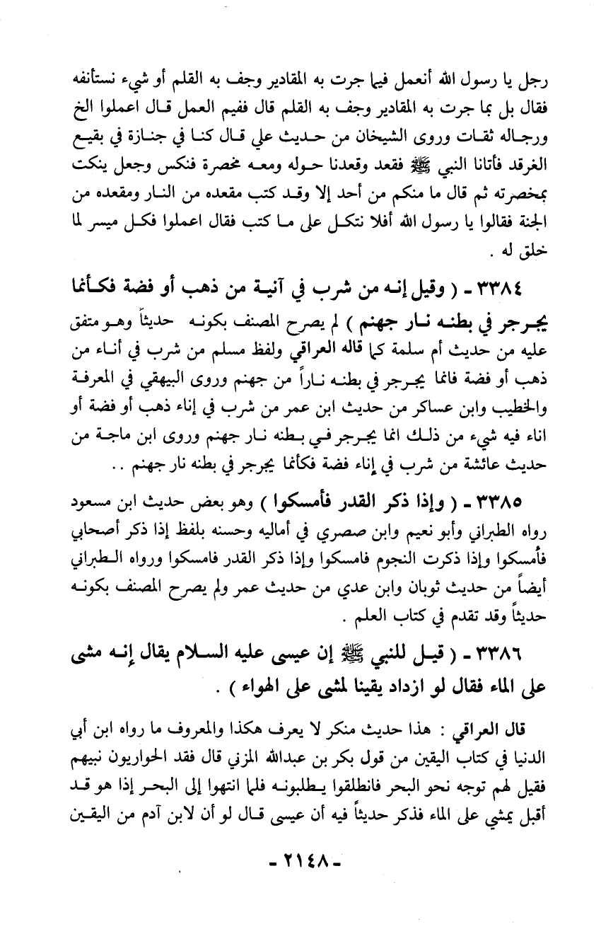 3384 - (وقيل إنه من شرب في آنية من ذهب أو فضة فكأنما يجرجر في بطنه نار جهنم) لم يصرح المصنف بكونه حديثاً وهو متفق عليه من حديث أم سلمة كما قاله العراقي ولفظ مسلم من شرب في إناء من ذهب أو فضة فإنما يجرجر في بطنه ناراً من جهنم وروى البيهقي في المعرفة والخطيب وابن عساكر من حديث ابن عمر من شرب في إناء ذهب أو فضة أو إناء فيه شيء من ذلك إنما يجرجر في بطنه نار جهنم وروى ابن ماجة من حديث عائشة من شرب في إناء فضة فكأنما يجرجر في بطنه نار جهنم.