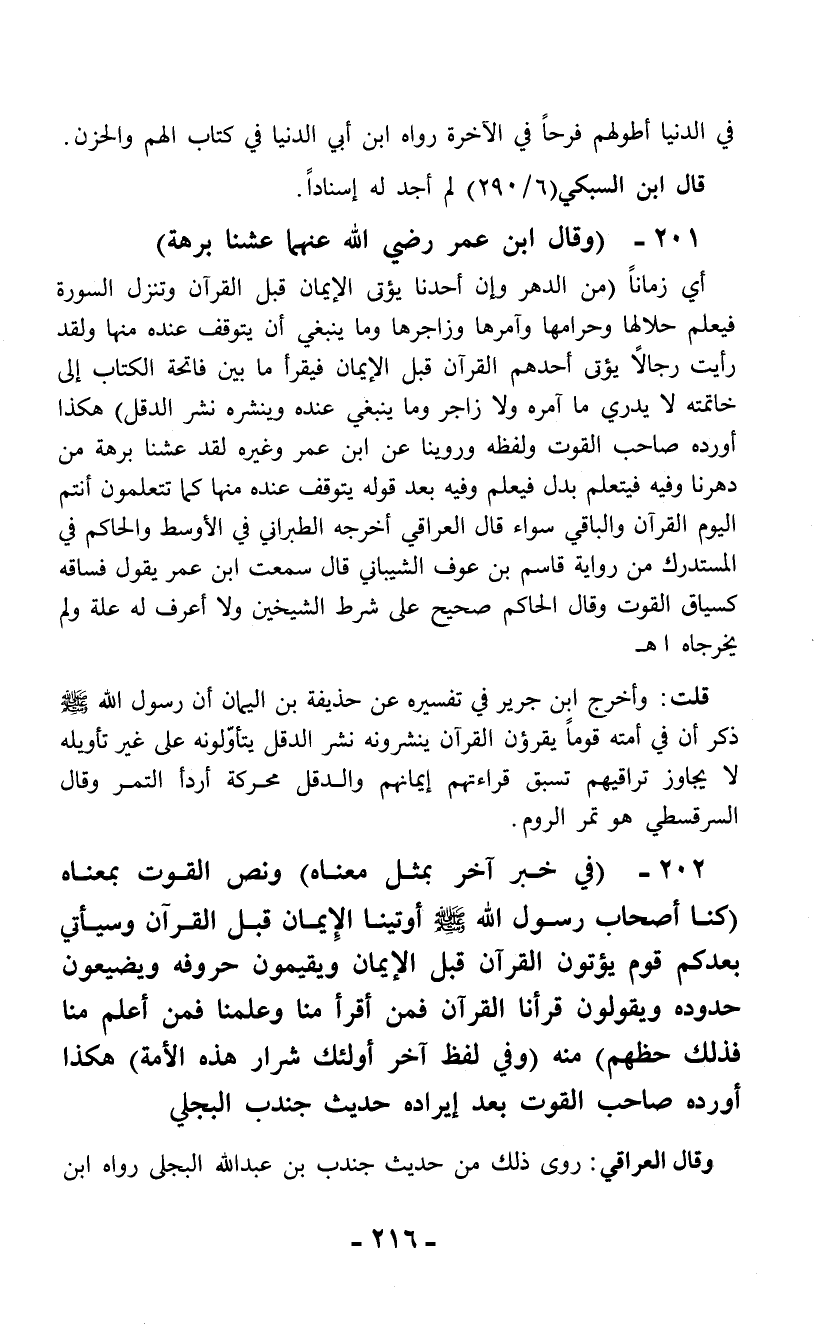 202 - (في خبر آخر بمثل معناه) ونص القوت بمعناه (كنا أصحاب رسول الله - صلى الله عليه وسلم - أوتينا الإيمان قبل القرآن وسيأتي بعدكم قوم يؤتون القرآن قبل الإيمان ويقيمون حروفه ويضيعون حدوده ويقولون قرأنا القرآن فمن أقرأ منا وعلمنا فمن أعلم منا فذلك حظهم) منه (وفي لفظ آخر أولئك شرار هذه الأمة) هكذا أورده صاحب القوت بعد إيراده حديث جندب البجلي