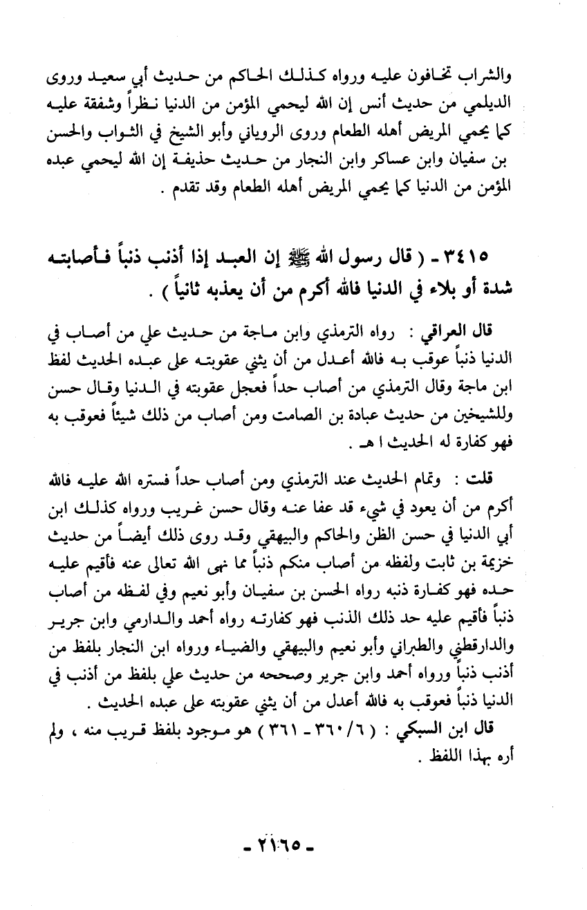 قال العراقي: رواه الترمذي وابن ماجة من حديث علي من أصاب في الدنيا ذنباً عوقب به فالله أعدل من أن يثني عقوبته على عبده الحديث لفظ ابن ماجة وقال الترمذي من أصاب حداً فعجل عقوبته في الدنيا وقال حسن وللشيخين من حديث عبادة بن الصامت ومن أصاب من ذلك شيئاً فعوقب به فهو كفارة له الحديث اهـ.