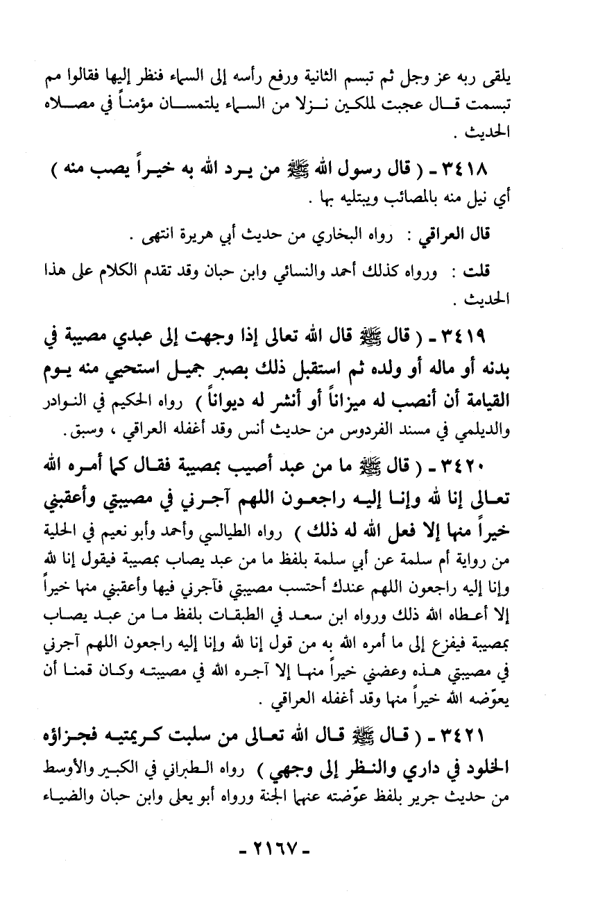 3421 - (قال - صلّى الله عليه وسلم - قال الله تعالى من سلبت كريمتيه فجزاؤه الخلود في داري والنظر إلى وجهي) رواه الطبراني في الكبير والأوسط من حديث جرير بلفظ عوّضته عنهما الجنة ورواه أبو يعلى وابن حبان والضياء