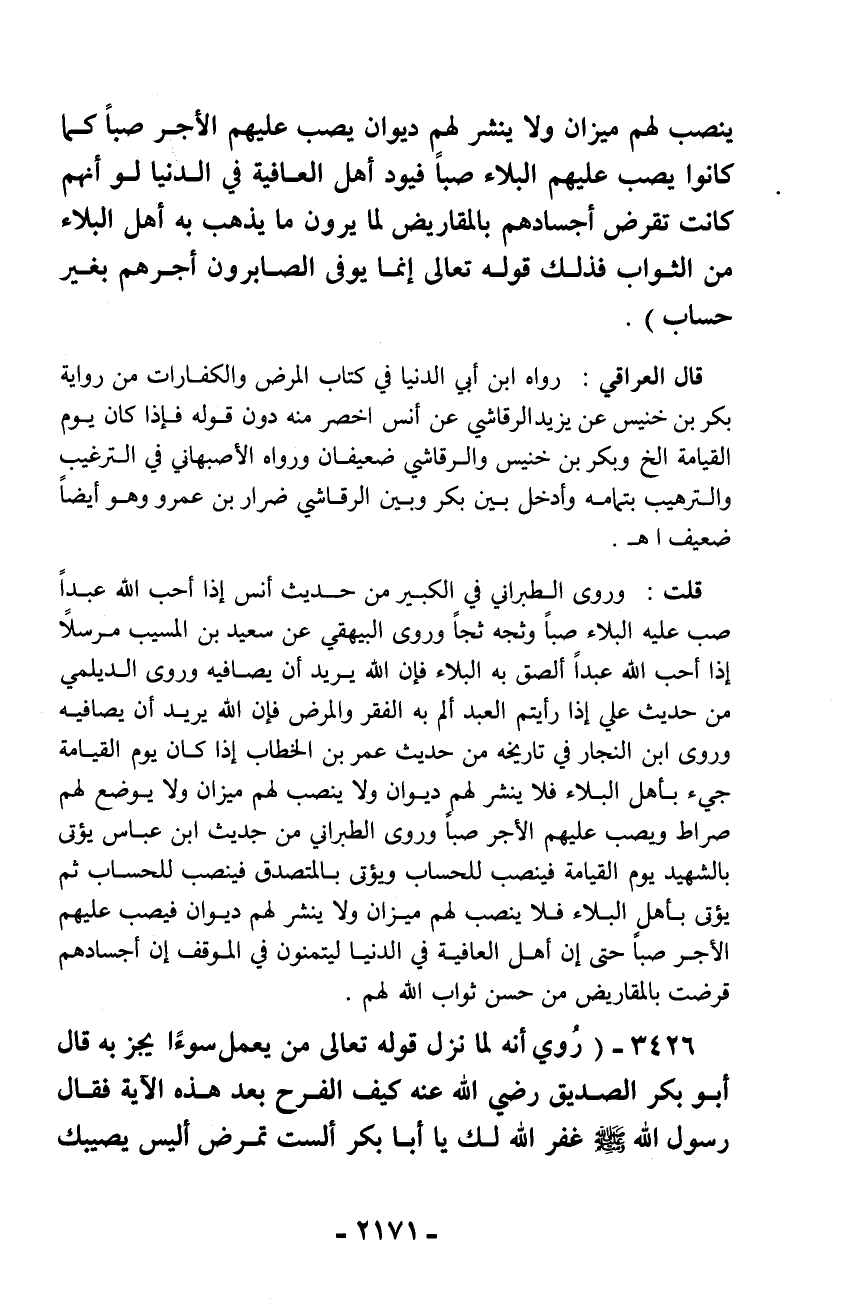 قلت: وروى الطبراني في الكبير من حديث أنس إذا أحب الله عبداً صب عليه البلاء صباً وثجه ثجاً وروى البيهقي عن سعيد بن المسيب مرسلاً إذا أحب الله عبداً ألصق به البلاء فإن الله يريد أن يصافيه وروى الديلمي من حديث علي إذا رأيتم العبد ألم به الفقر والمرض فإن الله يريد أن يصافيه وروى ابن النجار في تاريخه من حديث عمر بن الخطاب إذا كان يوم القيامة جيء بأهل البلاء فلا ينشر لهم ديوان ولا ينصب لهم ميزان ولا يوضع لهم صراط ويصب عليهم الأجر صباً وروى الطبراني من جديث ابن عباس يؤتى بالشهيد يوم القيامة فينصب للحساب ويؤتى بالمتصدق فينصب للحساب ثم يؤتى بأهل البلاء فلا ينصب لهم ميزان ولا ينشر لهم ديوان فيصب عليهم الأجر صباً حتى إن أهل العافية في الدنيا ليتمنون في الموقف إن أجسادهم قرضت بالمقاريض من حسن ثواب الله لهم.