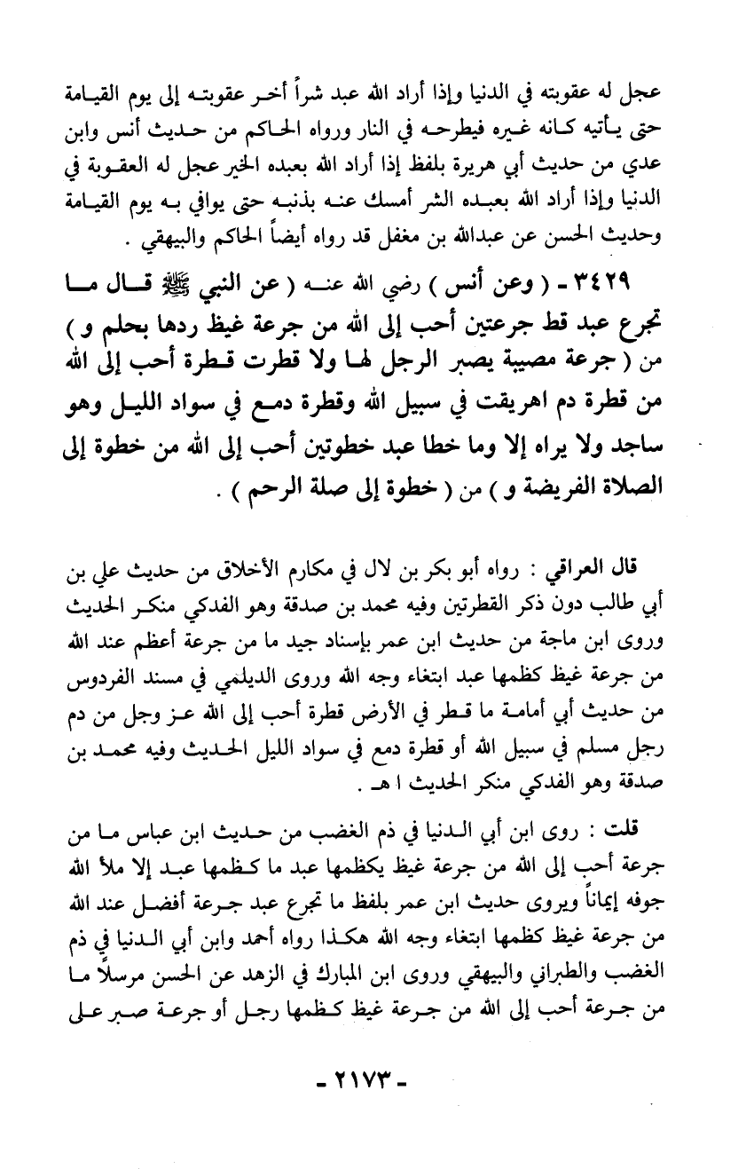 3429 - (وعن أنس) رضي الله عنه (عن النبي - صلّى الله عليه وسلم - قال ما تجرع عبد قط جرعتين أحب إلى الله من جرعة غيظ ردها بحلم و) من (جرعة مصيبة يصبر الرجل لها ولا قطرت قطرة أحب إلى الله من قطرة دم أهريقت في سبيل الله وقطرة دمع في سواد الليل وهو ساجد ولا يراه إلا وما خطا عبد خطوتين أحب إلى الله من خطوة إلى الصلاة الفريضة و) من (خطوة إلى صلة الرحم).