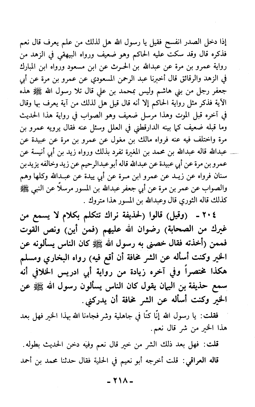 204 - (وقيل) قالوا (لحذيفة نراك تتكلم بكلام لا يسمع من غيرك من الصحابة) رضوان الله عليهم (فمن أين) ونص القوت فممن (أخذته فقال خصنى به رسول الله - صلى الله عليه وسلم - كان الناس يسألونه عن الخير وكنت أسأله عن الشر مخافة أن أقع فيه) رواه البخاري ومسلم هكذا مختصراً وفي آخره زيادة من رواية أبي إدريس الخلافي أنه سمع حذيفة بن اليمان يقول كان الناس يسألون رسول الله - صلى الله عليه وسلم - عن الخير وكنت أسأله عن الشر مخافة أن يدركني.