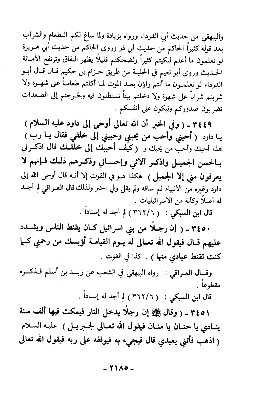 3451 - (وقال - صلّى الله عليه وسلم - إن رجلاً يدخل النار فيمكث فيها ألف سنة ينادي يا حنان يا منان فيقول الله تعالى لجبريل) عليه السلام (اذهب فأتني بعبدي قال فيجيء به فيوقفه على ربه فيقول الله تعالى