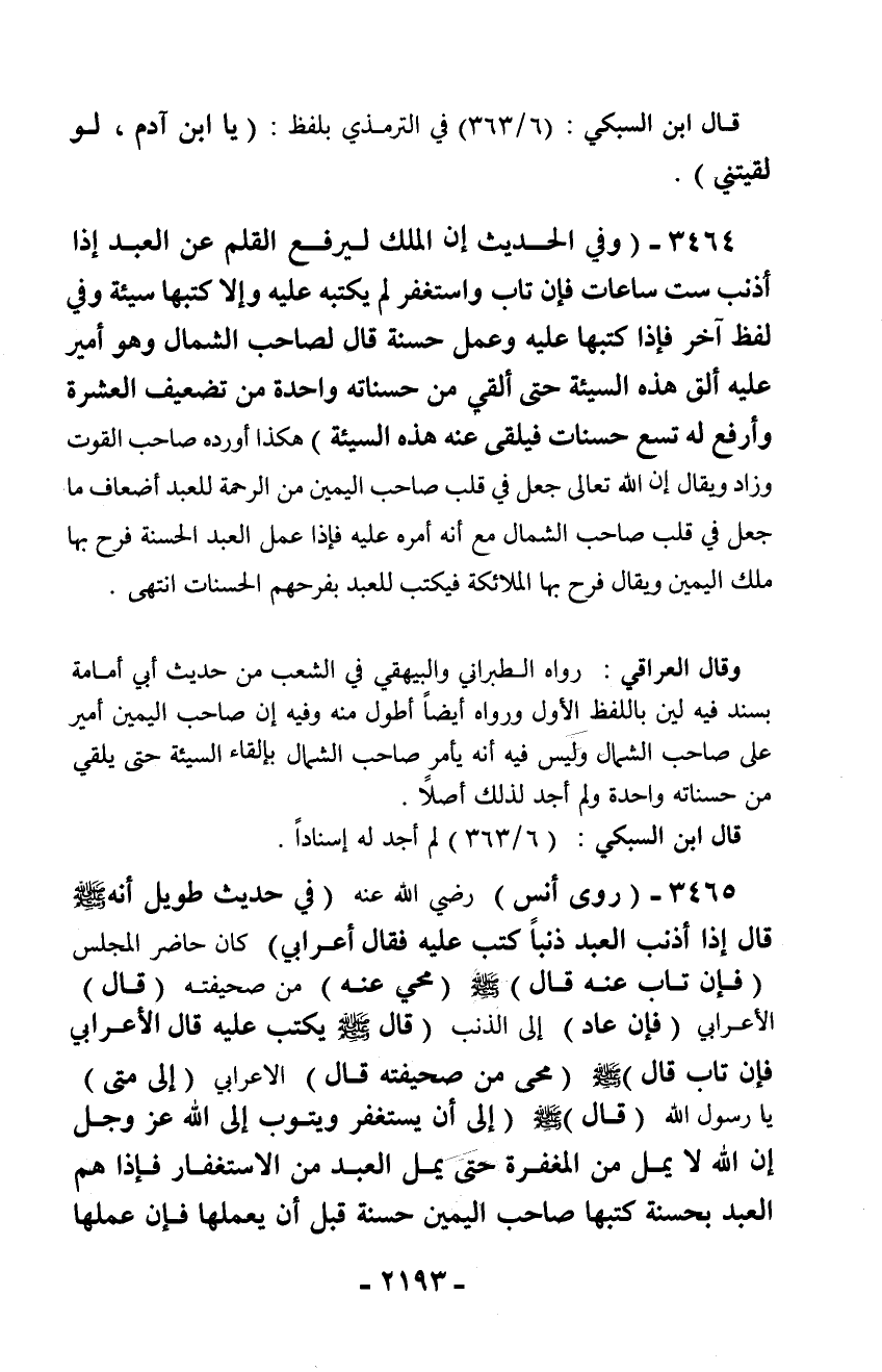 3465 - (روى أنس) رضي الله عنه (في حديث طويل أنه - صلّى الله عليه وسلم - قال إذا أذنب العبد ذنباً كتب عليه فقال أعرابي) كان حاضر المجلس (فإن تاب عنه قال) - صلّى الله عليه وسلم - (محي عنه) من صحيفته (قال) الأعرابي (فإن عاد) إلى الذنب (قال - صلّى الله عليه وسلم - يكتب عليه قال الأعرابي فإن تاب قال) - صلّى الله عليه وسلم - (محى من صحيفته قال) الأعرابي (إلى متى) يا رسول الله (قال) - صلّى الله عليه وسلم - (إلى أن يستغفر ويتوب إلى الله عز وجل إن الله لا يمل من المغفرة حتى يمل العبد من الاستغفار فإذا هم العبد بحسنة كتبها صاحب اليمين حسنة قبل أن يعملها فإن عملها