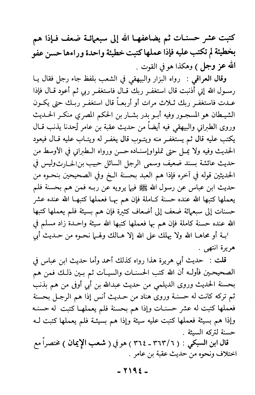 وقال العراقي: رواه البزار والبيهقي في الشعب بلفظ جاء رجل فقال يا رسول الله إني أذنبت قال استغفر ربك قال فاستغفر ربي ثم أعود قال فإذا عدت فاستغفر ربك ثلاث مرات أو أربعاً قال استغفر ربك حتى يكون الشيطان هو المسجور وفيه أبو بدر بشار بن الحكم المصري منكر الحديث وروى الطبراني والبيهقي فيه أيضاً من حديث عقبة بن عامر أحدنا يذنب قال يكتب عليه قال ثم يستغفر منه ويتوب قال يغفر له ويتاب عليه قال فيعود الحديث وفيه ولا يمل حتى تملوا وإسناده حسن ورواه الطبراني في الأوسط من حديث عائشة بسند ضعيف وسمى الرجل السائل حبيب بن الحارث وليس في الحديثين قوله في آخره فإذا هم العبد بحسنة الخ وفي الصحيحين بنحوه من حديث ابن عباس عن رسول الله - صلّى الله عليه وسلم - فيما يرويه عن ربه فمن هم بحسنة فلم يعملها كتبها الله عنده حسنة كاملة فإن هم بها فعملها كتبها الله عنده عشر حسنات إلى سبعمائة ضعف إلى أضعاف كثيرة فإن هم بسيئة فلم يعملها كتبها الله عنده حسنة كاملة فإن هم بها فعملها كتبها الله سيئة واحدة زاد مسلم في اية أو محاها الله ولا يهلك على الله إلا هالك ولهما نحوه من حديث أبي هريرة انتهى.