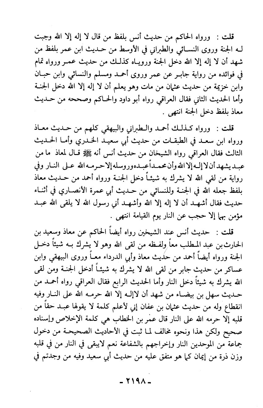 قلت: ورواه الحاكم من حديث أنس بلفظ من قال لا إله إلا الله وجبت له الجنة وروى النسائي والطبراني في الأوسط من حديث ابن عمر بلفظ من شهد أن لا إله إلا الله دخل الجنة وروياه كذلك من حديث عمر ورواه تمام في فوائده من رواية جابر عن عمر وروى أحمد ومسلم والنسائي وابن حبان وابن خزيمة من حديث عثمان من مات وهو يعلم أن لا إله إلا الله دخل الجنة وأما الحديث الثاني فقال العراقي رواه أبو داود والحاكم وصححه من حديث معاذ بلفظ دخل الجنة انتهى.