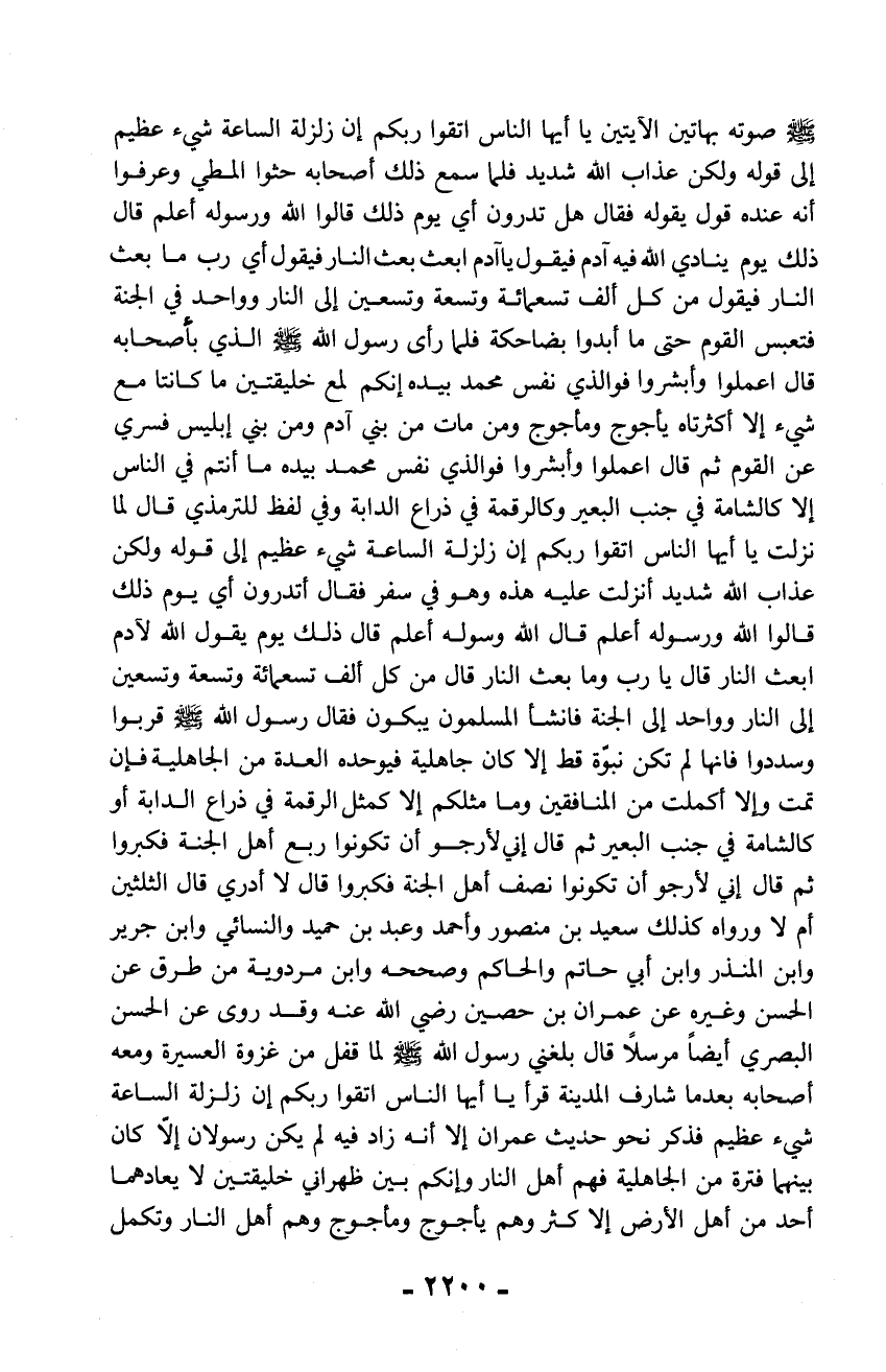 - صلّى الله عليه وسلم - صوته بهاتين الآيتين يا أيها الناس اتقوا ربكم إن زلزلة الساعة شيء عظيم إلى قوله ولكن عذاب الله شديد فلما سمع ذلك أصحابه حثوا المطي وعرفوا أنه عنده قول يقوله فقال هل تدرون أي يوم ذلك قالوا الله ورسوله أعلم قال ذلك يوم ينادي الله فيه آدم فيقول يا آدم ابعث بعث النار فيقول أي رب ما بعث النار فيقول من كل ألف تسعمائة وتسعة وتسعين إلى النار وواحد في الجنة فتعبس القوم حتى ما أبدوا بضاحكة فلما رأى رسول الله - صلّى الله عليه وسلم - الذي بأصحابه قال اعملوا وأبشروا فوالذي نفس محمد بيده إنكم لمع خليقتين ما كانتا مع شيء إلا أكثرتاه يأجوج ومأجوج ومن مات من بني آدم ومن بني إبليس فسري عن القوم ثم قال اعملوا وأبشروا فوالذي نفس محمد بيده ما أنتم في الناس إلا كالشامة في جنب البعير وكالرقمة في ذراع الدابة وفي لفظ للترمذي قال لما نزلت يا أيها الناس اتقوا ربكم إن زلزلة الساعة شيء عظيم إلى قوله ولكن عذاب الله شديد أنزلت عليه هذه وهو في سفر فقال أتدرون أي يوم ذلك قالوا الله ورسوله أعلم قال الله وسوله أعلم قال ذلك يوم يقول الله لآدم ابعث بعث النار قال يا رب وما بعث النار قال من كل ألف تسعمائة وتسعة وتسعين إلى النار وواحد إلى الجنة فأنشأ المسلمون يبكون فقال رسول الله - صلّى الله عليه وسلم - قربوا وسددوا فإنها لم تكن نبوّة قط إلا كان جاهلية فيوحده العدة من الجاهلية فإن تمت وإلا أكملت من المنافقين وما مثلكم إلا كمثل الرقمة في ذراع الدابة أو كالشامة في جنب البعير ثم قال إني لأرجو أن تكونوا ربع أهل الجنة فكبروا ثم قال إني لأرجو أن تكونوا نصف أهل الجنة فكبروا قال لا أدري قال الثلثين أم لا ورواه كذلك سعيد بن منصور وأحمد وعبد بن حميد والنسائي وابن جرير وابن المنذر وابن أبي حاتم والحاكم وصححه وابن مردويه من طرق عن الحسن وغيره عن عمران بن حصين رضي الله عنه وقد روى عن الحسن البصري أيضاً مرسلاً قال بلغني رسول الله - صلّى الله عليه وسلم - لما قفل من غزوة العسيرة ومعه أصحابه بعدما شارف المدينة قرأ يا أيها الناس اتقوا ربكم إن زلزلة الساعة شيء عظيم فذكر نحو حديث عمران إلا أنه زاد فيه لم يكن رسولان إلاَّ كان بينهما فترة من الجاهلية فهم أهل النار وإنكم بين ظهراني خليقتين لا يعادهما أحد من أهل الأرض إلا كثر وهم يأجوج ومأجوج وهم أهل النار وتكمل