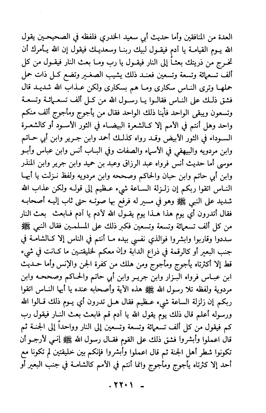 العدة من المنافقين وأما حديث أبي سعيد الخدري فلفظه في الصحيحين يقول الله يوم القيامة يا آدم فيقول لبيك ربنا وسعديك فيقول إن الله يأمرك أن تخرج من ذريتك بعثاً إلى النار فيقول يا رب وما بعث النار فيقول من كل ألف تسعمائة وتسعة وتسعين فعند ذلك يشيب الصغير وتضع كل ذات حمل حملها وترى الناس سكارى وما هم بسكارى ولكن عذاب الله شديد قال فشق ذلك على الناس فقالوا يا رسول الله من كل ألف تسعمائة وتسعة وتسعون ويبقى الواحد فأينا ذلك الواحد فقال من يأجوج ومأجوج ألف منكم واحد وهل أنتم في الأمم إلا كالشعرة البيضاء في الثور الأسود أو كالشعرة السوداء في الثور الأبيض وقد رواه كذلك أحمد وابن جرير وابن أبي حاتم وابن مردويه والبيهقي في الأسماء والصفات وفي الباب أنس وابن عباس وأبو موسى أما حديث أنس فرواه عبد الرزاق وعبد بن حميد وابن جرير وابن المنذر وابن أبي حاتم وابن حبان والحاكم وصححه وابن مردويه ولفظ نزلت يا أيها الناس اتقوا ربكم إن زلزلة الساعة شيء عظيم إلى قوله ولكن عذاب الله شديد على النبي - صلّى الله عليه وسلم - وهو في مسير له فرفع بها صوته حتى ثاب إليه أصحابه فقال أتدرون أي يوم هذا هذا يوم يقول الله لآدم يا آدم فابعث بعث النار من كل ألف تسعمائة وتسعة وتسعين فكبر ذلك على المسلمين فقال النبي - صلّى الله عليه وسلم - سددوا وقاربوا وأبشروا فوالذي نفسي بيده ما أنتم في الناس إلا كالشامة في جنب البعير أو كالرقمة في ذراع الدابة وإن معكم لخليقتين ما كانت في شيء قط إلا أكثرتاه يأجوج ومأجوج ومن هلك من كفرة الجن والإنس وأما حديث ابن عباس فرواه البزار وابن جرير وابن أبي حاتم والحاكم وصححه وابن مردويه ولفظه تلا رسول الله - صلّى الله عليه وسلم - هذه الآية وأصحابه عنده يا أيها الناس اتقوا ربكم إن زلزلة الساعة شيء عظيم فقال هل تدرون أي يوم ذلك قالوا الله ورسوله أعلم قال ذلك يوم يقول الله يا آدم قم فابعث بعث النار فيقول رب كم فيقول من كل ألف تسعمائة وتسعة وتسعين إلى النار وواحداً إلى الجنة ثم قال اعملوا وأبشروا فشق ذلك على القوم فقال رسول الله - صلّى الله عليه وسلم - إني لأرجو أن تكونوا شطر أهل الجنة ثم قال اعملوا وأبشروا فإنكم بين خليقتين لم تكونا مع أحد إلا كثرتاه يأجوج ومأجوج وإنما أنتم في الأمم كالشامة في جنب البعير أو