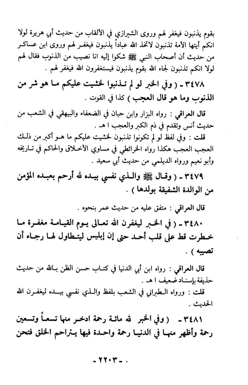 3478 - (وفي الخبر لو لم تذنبوا لخشيت عليكم ما هو شر من الذنوب وما هو قال العجب) كذا في القوت.