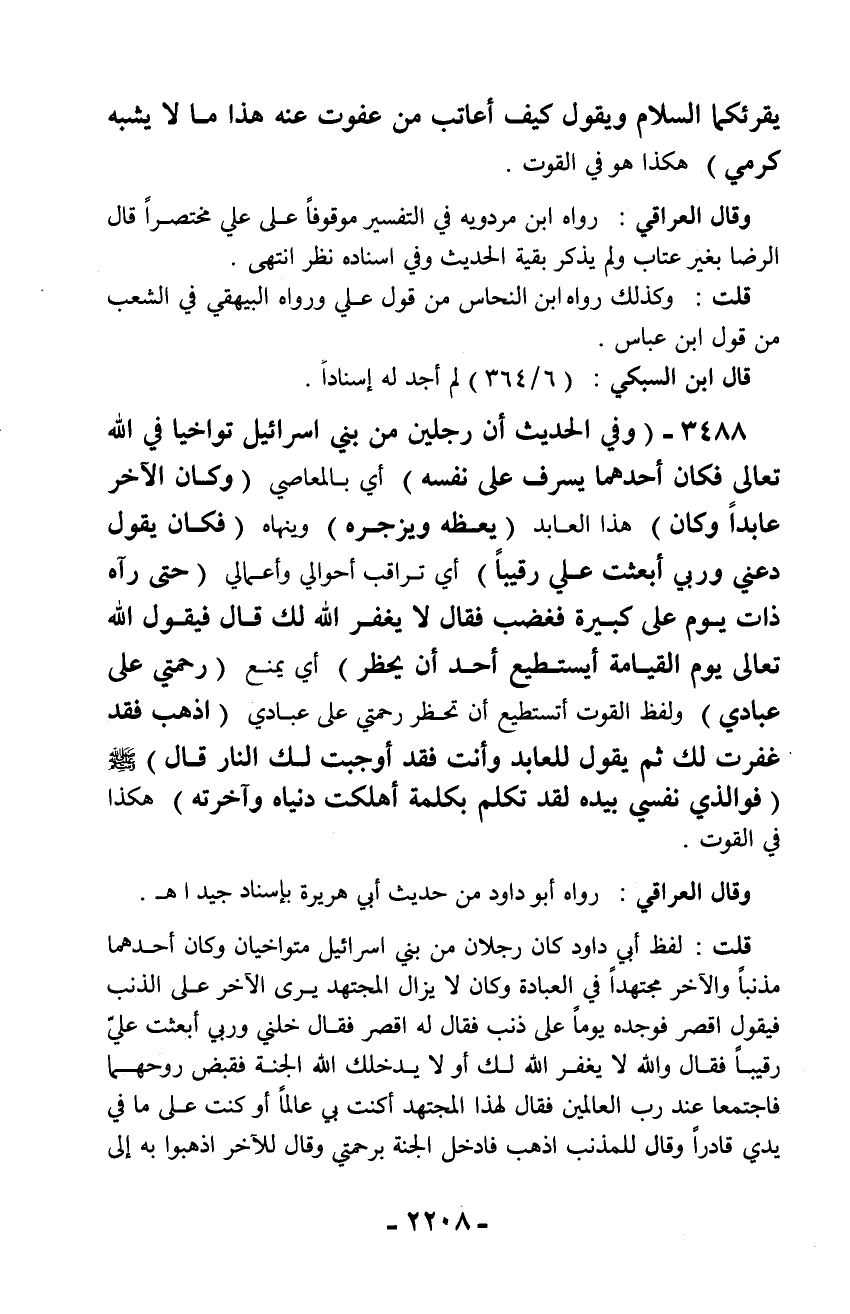 3488 - (وفي الحديث أن رجلين من بني إسرائيل تواخيا في الله تعالى فكان أحدهما يسرف على نفسه) أي بالمعاصي (وكان الآخر عابداً وكان) هذا العابد (يعظه ويزجره) وينهاه (فكان يقول دعني وربي أبعثت علي رقيباً) أي تراقب أحوالي وأعمالي (حتى رآه ذات يوم على كبيرة فغضب فقال لا يغفر الله لك قال فيقول الله تعالى يوم القيامة أيستطيع أحد أن يحظر) أي يمنع (رحمتي على عبادي) ولفظ القوت أتستطيع أن تحظر رحمتي على عبادي (اذهب فقد غفرت لك ثم يقول للعابد وأنت فقد أوجبت لك النار قال) - صلّى الله عليه وسلم - (فوالذي نفسي بيده لقد تكلم بكلمة أهلكت دنياه وآخرته) هكذا في القوت.