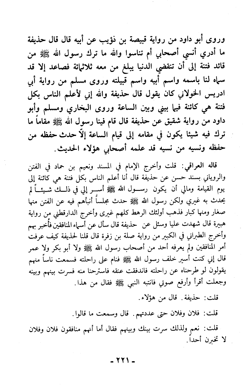 قاله العراقي: قلت وأخرج الإمام في المسند ونعيم بن حماد في الفتن والروياني بسند حسن عن حذيفة قال أنا أعلم الناس بكل فتنة هي كائنة إلى يوم القيامة ومالي أن يكون رسول الله - صلى الله عليه وسلم - أسر إلي في ذلك شيئاً لم يحدث به غيري ولكن رسول الله - صلى الله عليه وسلم - حدث مجلساً أنبأهم فيه عن الفتن منها صغار ومنها كبار فذهب أولئك الرهط كلهم غيرى وأخرج الدارقطني من رواية هبيرة قال شهدت عليا وسئل عن حذيفة قال سأل عن أسماء المنافقين فأخبر بهم وأخرج الطبراني في الكبير من رواية صلة بن زفرة قال قلنا لحذيفة كيف عرفت أمر المنافقين ولم يعرفه أحد من أصحاب رسول الله - صلى الله عليه وسلم - ولا أبو بكر ولا عمر قال إني كنت أسير خلف رسول الله - صلى الله عليه وسلم - فنام على راحلته فسمعت ناساً منهم يقولون لو طرحناه عن راحلته فاندفقت عنقه فاسترحنا منه فسرت بينهم وبينه وجعلت أقرأ وأرفع صوتي فانتبه النبي - صلى الله عليه وسلم - فقال من هذا.