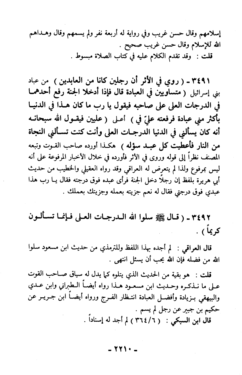 3491 - (روي في الأثر أن رجلين كانا من العابدين) من عباد بني إسرائيل (متساويين في العبادة قال فإذا أدخلا الجنة رفع أحدهما في الدرجات العلى على صاحبه فيقول يا رب ما كان هذا في الدنيا بأكثر مني عبادة فرفعته عليّ في) أعلى (عليين فيقول الله سبحانه أنه كان يسألني في الدنيا الدرجات العلى وأنت كنت تسألني النجاة من النار فأعطيت كل عبد سؤله) هكذا أورده صاحب القوت وتبعه المصنف نظراً إلى قوله وروى في الأثر فأورده في خلال الأخبار المرفوعة على أنه ليس بمرفوع ولذا لم يتعرض له العراقي وقد رواه العقيلي والخطيب من حديث أبي هريرة بلفظ إن رجلاً دخل الجنة فرأى عبده فوق درجته فقال يا رب هذا عبدي فوق درجتي فقال له نعم جزيته بعمله وجزيتك بعملك.