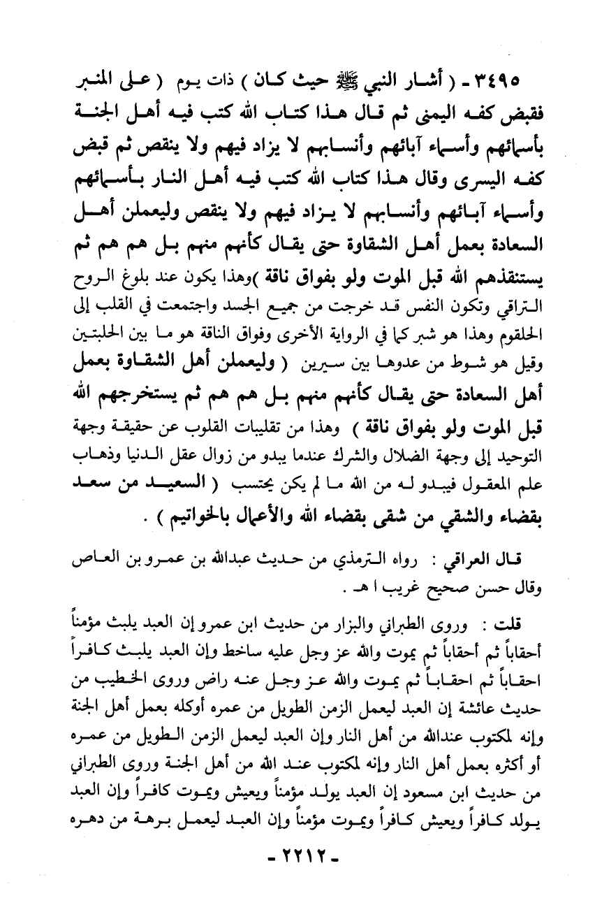 3495 - (أشار النبي - صلّى الله عليه وسلم - حيث كان) ذات يوم (على المنبر فقبض كفه اليمنى ثم قال هذا كتاب الله كتب فيه أهل الجنة بأسمائهم وأسماء آبائهم وأنسابهم لا يزاد فيهم ولا ينقص ثم قبض كفه اليسرى وقال هذا كتاب الله كتب فيه أهل النار بأسمائهم وأسماء آبائهم وأنسابهم لا يزاد فيهم ولا ينقص وليعملن أهل السعادة بعمل أهل الشقاوة حتى يقال كأنهم منهم بل هم هم ثم يستنقذهم الله قبل الموت ولو بفواق ناقة) وهذا يكون عند بلوغ الروح التراقي وتكون النفس قد خرجت من جميع الجسد واجتمعت في القلب إلى الحلقوم وهذا هو شبري كما في الرواية الأخرى وفواق الناقة هو ما بين الحلبتين وقيل هو شوط من عدوها بين سيرين (وليعملن أهل الشقاوة بعمل أهل السعادة حتى يقال كأنهم منهم بل هم هم ثم يستخرجهم الله قبل الموت ولو بفواق ناقة) وهذا من تقليبات القلوب عن حقيقة وجهة التوحيد إلى وجهة الضلال والشرك عندما يبدو من زوال عقل الدنيا وذهاب علم المعقول فيبدو له من الله ما لم يكن يحتسب (السعيد من سعد بقضاء والشقي من شقى بقضاء الله والأعمال بالخواتيم).