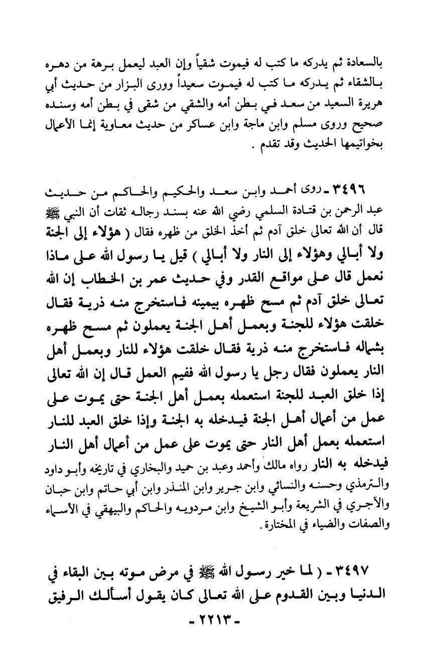 3496 - روى أحمد وابن سعد والحكيم والحاكم من حديث عبد الرحمن بن قتادة السلمي رضي الله عنه بسند رجاله ثقات أن النبي - صلّى الله عليه وسلم - قال إن الله تعالى خلق آدم ثم أخذ الخلق من ظهره فقال (هؤلاء إلى الجنة ولا أبالي وهؤلاء إلى النار ولا أبالي) قيل يا رسول الله على ماذا نعمل قال على مواقع القدر وفي حديث عمر بن الخطاب إن الله تعالى خلق آدم ثم مسح ظهره بيمينه فاستخرج منه ذرية فقال خلقت هؤلاء للجنة وبعمل أهل الجنة يعملون ثم مسح ظهره بشماله فاستخرج منه ذرية فقال خلقت هؤلاء للنار وبعمل أهل النار يعملون فقال رجل يا رسول الله ففيم العمل قال إن الله تعالى إذا خلق العبد للجنة استعمله بعمل أهل الجنة حتى يموت على عمل من أعمال أهل الجنة فيدخله به الجنة وإذا خلق العبد للنار استعمله بعمل أهل النار حتى يموت على عمل من أعمال أهل النار فيدخله به النار رواه مالك وأحمد وعبد بن حميد والبخاري في تاريخه وأبو داود والترمذي وحسنه والنسائي وابن جرير وابن المنذر وابن أبي حاتم وابن حبان والآجري في الشريعة وأبو الشيخ وابن مردويه والحاكم والبيهقي في الأسماء والصفات والضياء في المختارة.
