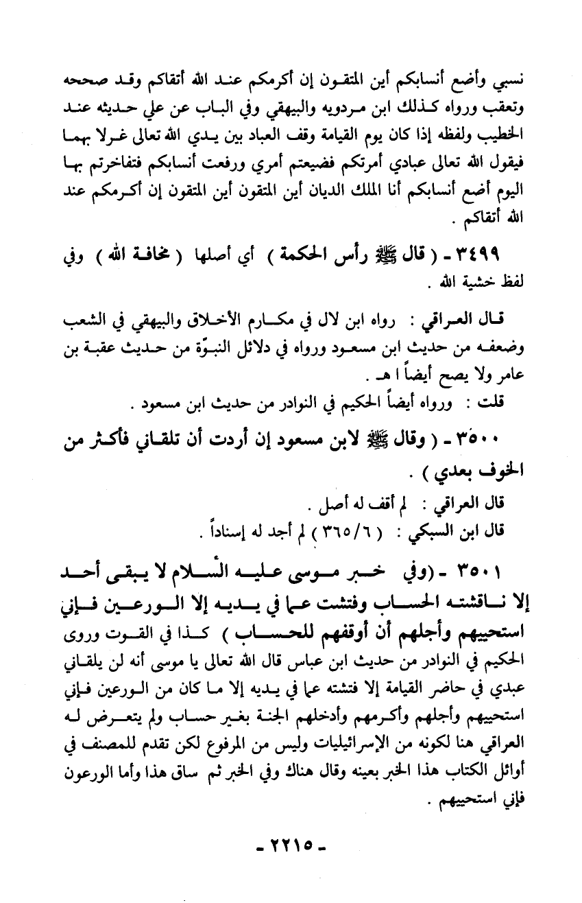 3501 - (وفي خبر موسى عليه السلام لا يبقى أحد إلا ناقشته الحساب وفتشت عما في يديه إلا الورعين فإني أستحييهم وأجلهم أن أوقفهم للحساب) كذا في القوت وروى الحكيم في النوادر من حديث ابن عباس قال الله تعالى يا موسى أنه لن يلقاني عبدي في حاضر القيامة إلا فتشته عما في يديه إلا ما كان من الورعين فإني أستحييهم وأجلهم وأكرمهم وأدخلهم الجنة بغير حساب ولم يتعرض له العراقي هنا لكونه من الإسرئيليات وليس من المرفوع لكن تقدم للمصنف في أوائل الكتاب هذا الخبر بعينه وقال هناك وفي الخبر ثم ساق هذا وأما الورعون فإني أستحييهم.
