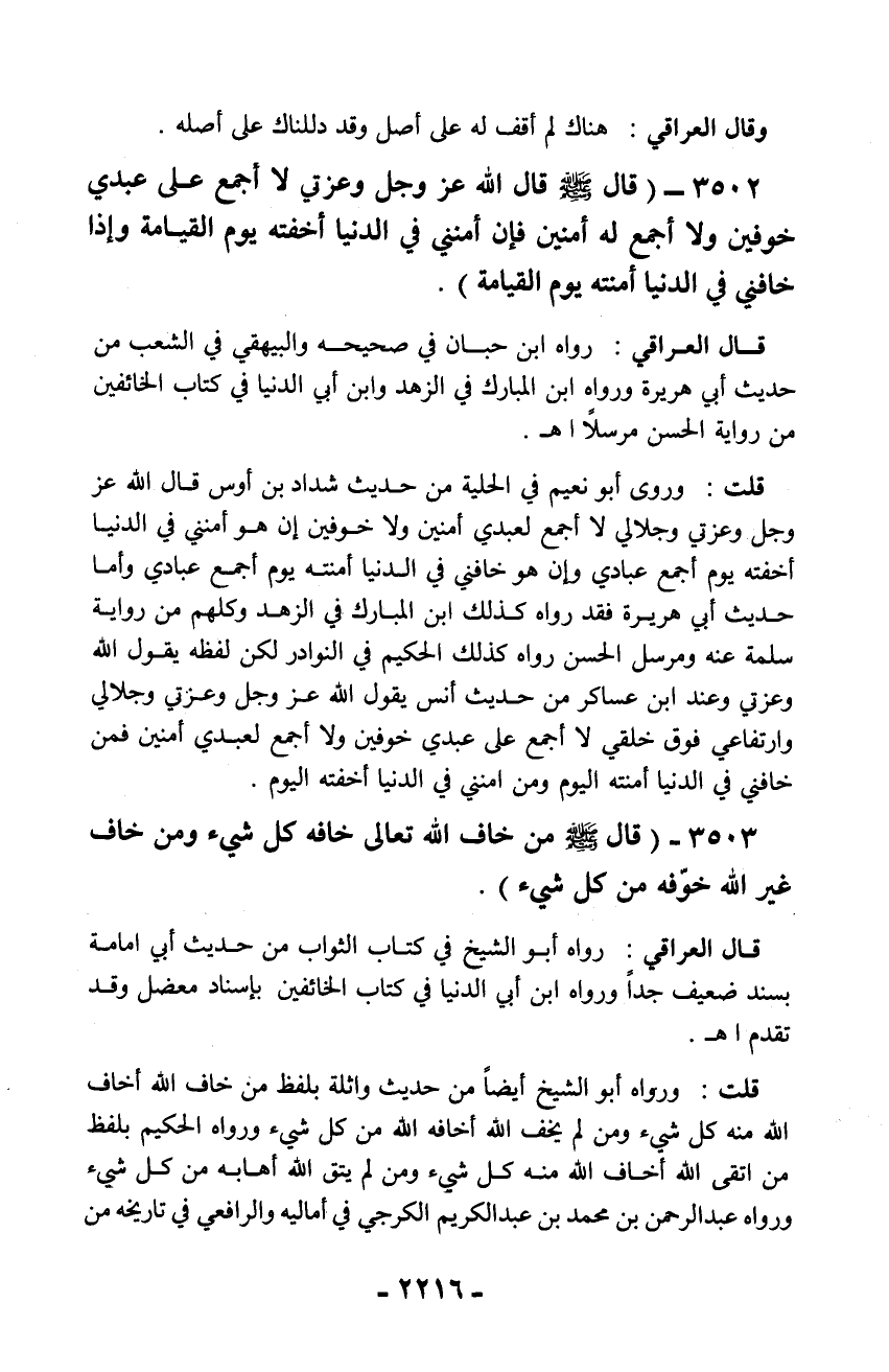 3502 - (قال - صلّى الله عليه وسلم - قال الله عز وجل وعزتي لا أجمع على عبدي خوفين ولا أجمع له أمنين فإن أمنني في الدنيا أخفته يوم القيامة وإذا خافني في الدنيا أمنته يوم القيامة).