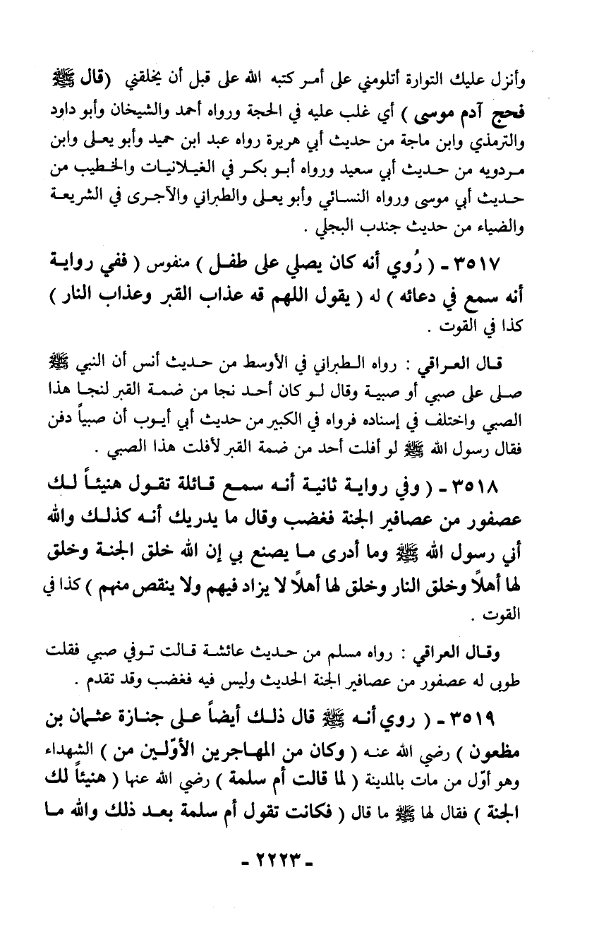 3518 - (وفي رواية ثانية أنه سمع قائلة تقول هنيئاً لك عصفور من عصافير الجنة فغضب وقال ما يدريك أنه كذلك والله أني رسول الله - صلّى الله عليه وسلم - وما أدرى ما يصنع بي إن الله خلق الجنة وخلق لها أهلاً وخلق النار وخلق لها أهلاً لا يزاد فيهم ولا ينقص منهم) كذا في القوت.