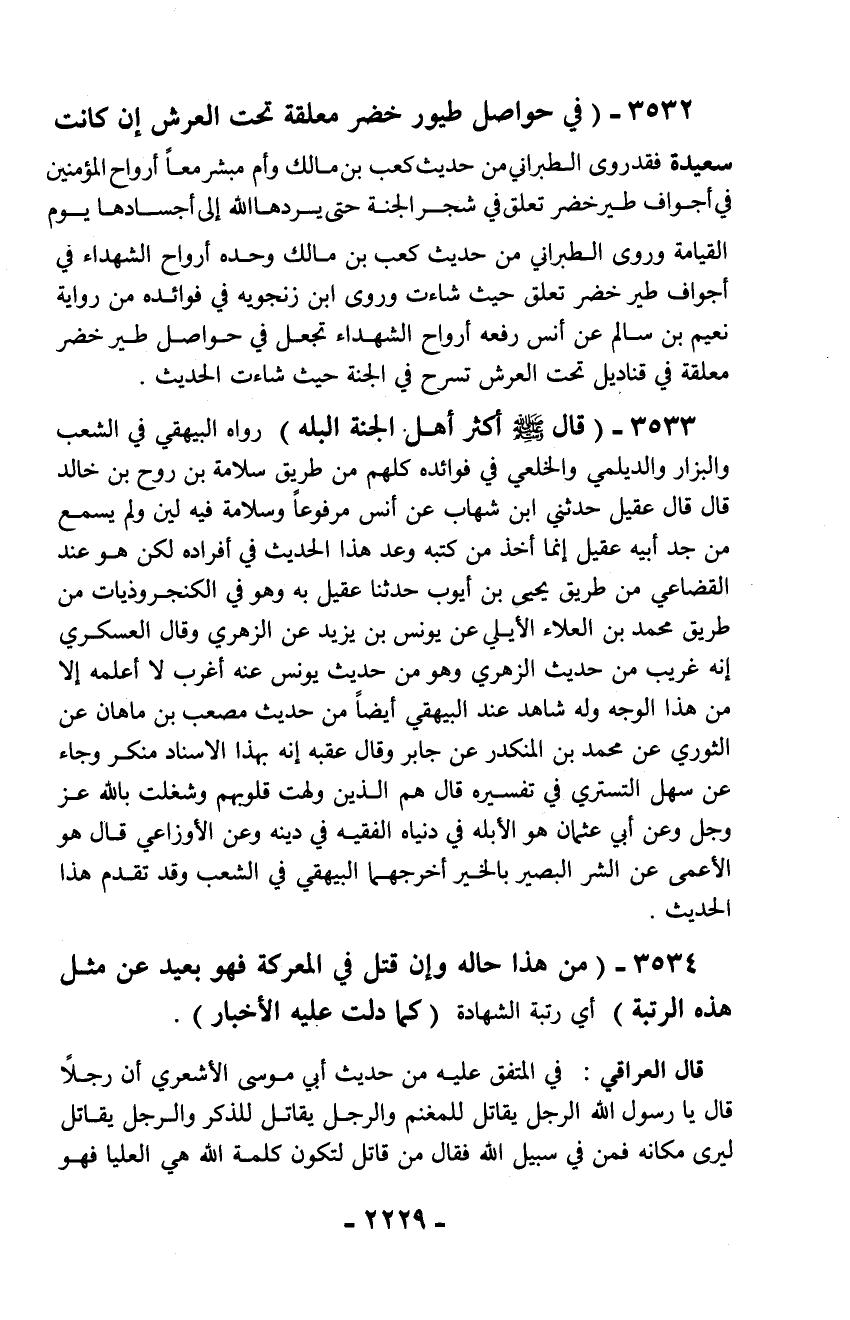 3532 - (في حواصل طيور خضر معلقة تحت العرش إن كانت سعيدة فقد روى الطبراني من حديث كعب بن مالك وأم مبشر معاً أرواح المؤمنين في أجواف طير خضر تعلق في شجر الجنة حتى يردها الله إلى أجسادها يوم القيامة وروى الطبراني من حديث كعب بن مالك وحده أرواح الشهداء في أجواف طير خضر تعلق حيث شاءت وروى ابن زنجويه في فوائده من رواية نعيم بن سالم عن أنس رفعه أرواح الشهداء تجعل في حواصل طير خضر معلقة في قناديل تحت العرش تسرح في الجنة حيث شاءت الحديث.