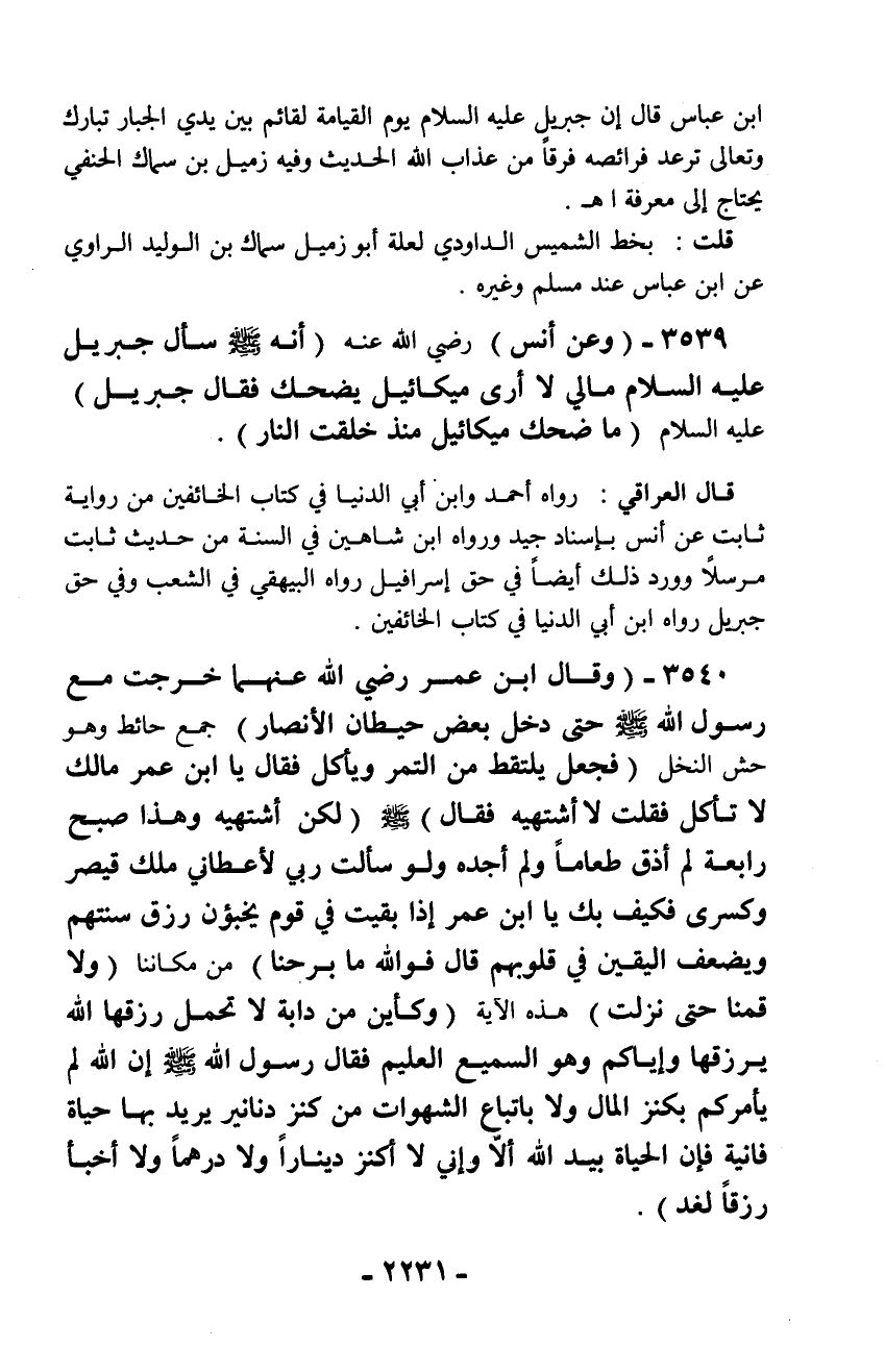 3539 - (وعن أنس) رضي الله عنه (أنه - صلّى الله عليه وسلم - سأل جبريل عليه السلام مالي لا أرى ميكائيل يضحك فقال جبريل) عليه السلام ما ضحك ميكائيل منذ خلقت النار).