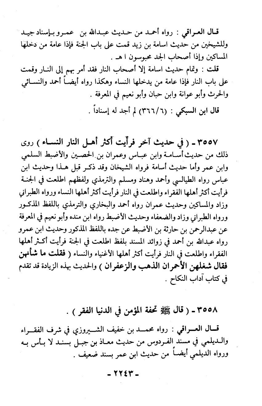 3557 - (في حديث آخر فرآيت أكثر أهل النار النساء) روى ذلك من حديث أسامة وابن عباس وعمران بن الحصين والأضبط السلمي وابن عمر وأما حديث أسامة فرواه الشيخان وقد ذكر قبل هذا وحديث ابن عباس رواه الطيالسي وأحمد وهناد ومسلم والترمذي ولفظهم اطلعت في الجنة فرأيت أكثر أهلها الفقراء واطلعت في النار فرأيت أكثر أهلها النساء ورواه الطبراني وزاد والمساكين وحديث عمران رواه أحمد والبخاري والترمذي باللفظ المذكور ورواه الطبراني وزاد والضعفاء وحديث الأضبط رواه ابن منده وأبو نعيم في المعرفة عن عبد الرحمن بن حارثة بن الأضبط عن جده باللفظ المذكور وحديث ابن عمرو رواه عبد الله بن أحمد في زوائد المسند بلفظ اطلعت في الجنة فرأيت أكثر أهلها الفقراء واطلعت في النار فرأيت أكثر أهلها الأغنياء والنساء (فقلت مما شأنهن فقال شغلهن الأحمران الذهب والزعفران) والحديث بهذه الزيادة قد تقدم في كتاب آداب النكاح.