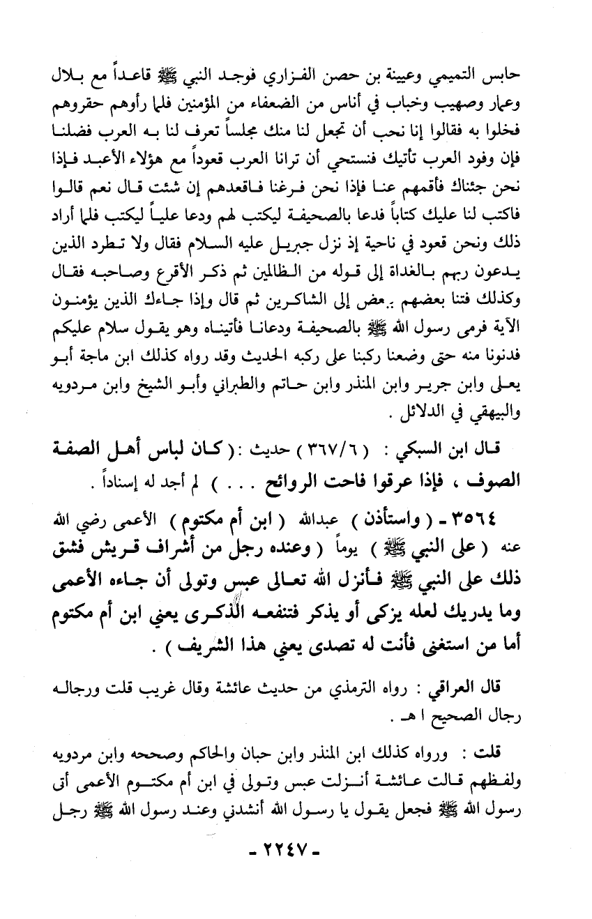 3564 - (واستأذن) عبد الله (ابن أم مكتوم) الأعمى رضي الله عنه (على النبي - صلّى الله عليه وسلم -) يوماً (وعنده رجل من أشراف قريش فشق ذلك على النبي - صلّى الله عليه وسلم - فأنزل الله تعالى عبس وتولى أن جاءه الأعمى وما يدريك لعله يزكى أو يذكر فتنفعه الذكرى يعني ابن أم مكتوم أما من استغنى فأنت له تصدى يعني هذا الشريف).