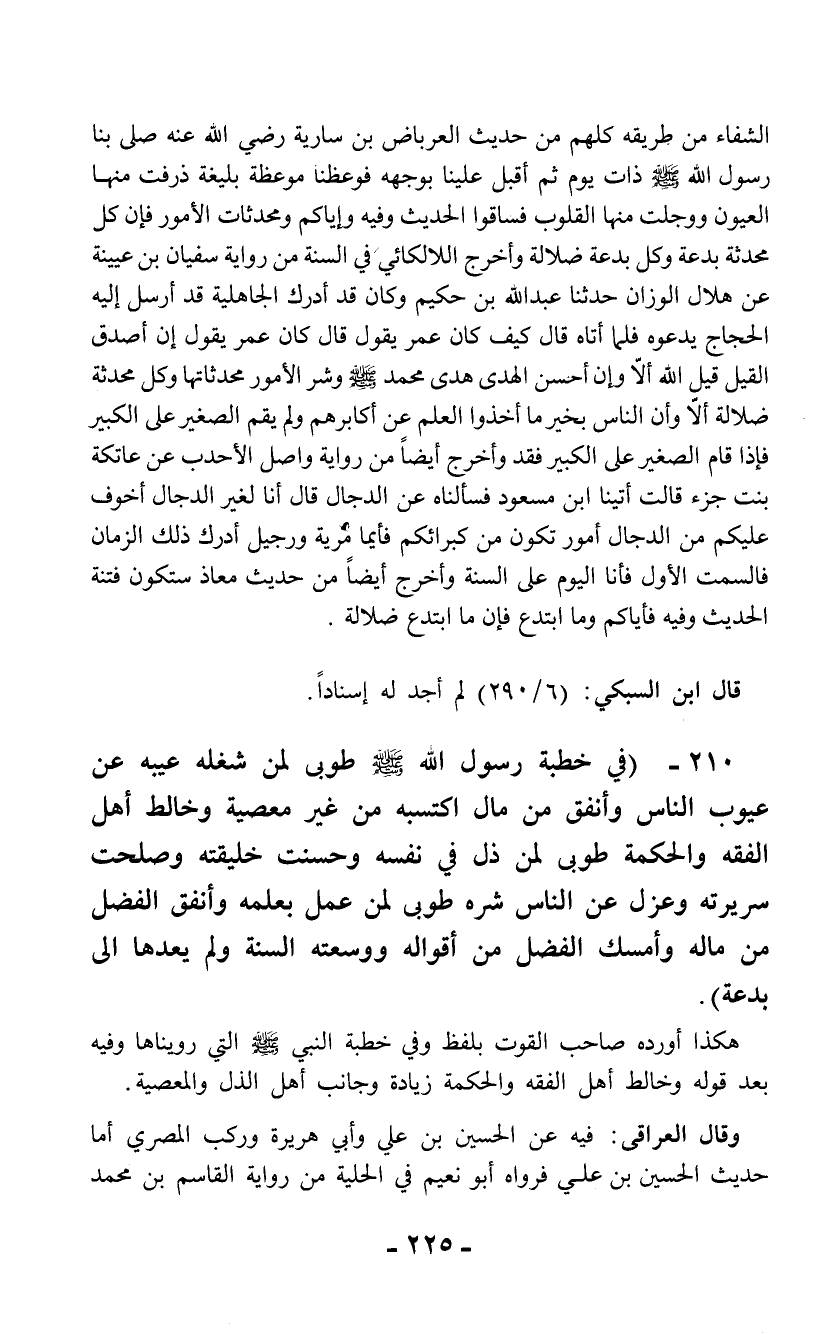 الشفاء من طريقه كلهم من حديث العرباض بن سارية رضي الله عنه صلى بنا رسول الله - صلى الله عليه وسلم - ذات يوم ثم أقبل علينا بوجهه فوعظنا موعظة بليغة ذرفت منها العيون ووجلت منها القلوب فساقوا الحديث وفيه وإياكم ومحدثات الأمور فإن كل محدثة بدعة وكل بدعة ضلالة وأخرج اللالكائي في السنة من رواية سفيان بن عيينة عن هلال الوزان حدثنا عبد الله بن حكيم وكان قد أدرك الجاهلية قد أرسل إليه الحجاج يدعوه فلما أتاه قال كيف كان عمر يقول قال كان عمر يقول إن أصدق القيل قيل الله ألاّ وإن أحسن الهدى هدى محمد - صلى الله عليه وسلم - وشر الأمور محدثاتها وكل محدثة ضلالة ألاّ وأن الناس بخير ما أخذوا العلم عن أكابرهم ولم يقم الصغير على الكبير فإذا قام الصغير على الكبير فقد وأخرج أيضاً من رواية واصل الأحدب عن عاتكة بنت جزء قالت أتينا ابن مسعود فسألناه عن الدجال قال أنا لغير الدجال أخوف عليكم من الدجال أمور تكون من كبرائكم فأيما مرية ورجيل أدرك ذلك الزمان فالسمت الأول فأنا اليوم على السنة وأخرج أيضاً من حديث معاذ ستكون فتنة الحديث وفيه فإياكم وما ابتدع فإن ما ابتدع ضلالة.