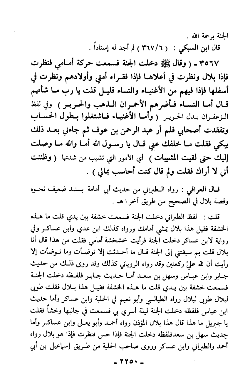 3567 - (وقال - صلّى الله عليه وسلم - دخلت الجنة فسمعت حركة أمامي فنظرت فإذا بلال ونظرت في أعلاها فإذا فقراء أمتي وأولادهم ونظرت في أسفلها فإذا فيهم من الأغنياء والنساء قليل قلت يا رب ما شأنهم قال أما النساء فأضرهم الأحمران الذهب والحرير) وفي لفظ الزعفران بدل الحرير (وأما الأغنياء فاشتغلوا بطول الحساب وتفقدت أصحابي فلم أر عبد الرحمن بن عوف ثم جاءني بعد ذلك يبكي فقلت ما خلفك عني قال يا رسول الله أما والله ما وصلت إليك حتى لقيت المشيبات) أي الأمور التي تشيب من شدتها (وظننت أني لا أراك فقلت ولم قال كنت أحاسب بمالي).