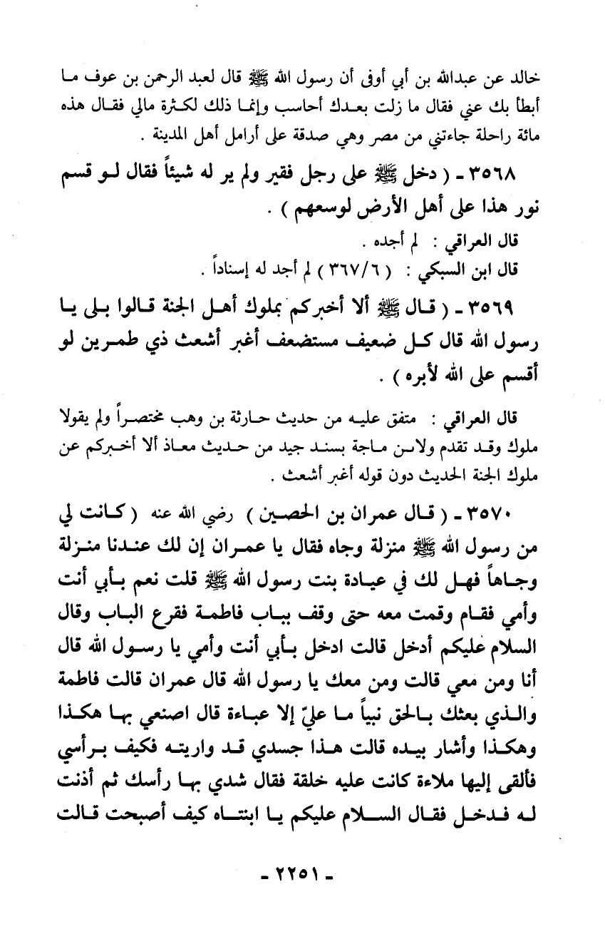 3570 - (قال عمران بن الحصين) رضي الله عنه (كانت لي من رسول الله - صلّى الله عليه وسلم - منزلة وجاه فقال يا عمران إن لك عندنا منزلة وجاهاً فهل لك في عيادة بنت رسول الله - صلّى الله عليه وسلم - قلت نعم بأبي أنت وأمي فقام وقمت معه حتى وقف بباب فاطمة فقرع الباب وقال السلام عليكم أدخل قالت ادخل بأبي أنت وأمي يا رسول الله قال أنا ومن معي قالت ومن معك يا رسول الله قال عمران قالت فاطمة والذي بعثك بالحق نبياً ما عليّ إلا عباءة قال اصنعي بها هكذا وهكذا وأشار بيده قالت هذا جسدي قد واريته فكيف برأسي فألقى إليها ملاءة كانت عليه خلقة فقال شدي بها رأسك ثم أذنت له فدخل فقال السلام عليكم يا ابنتاه كيف أصبحت قالت