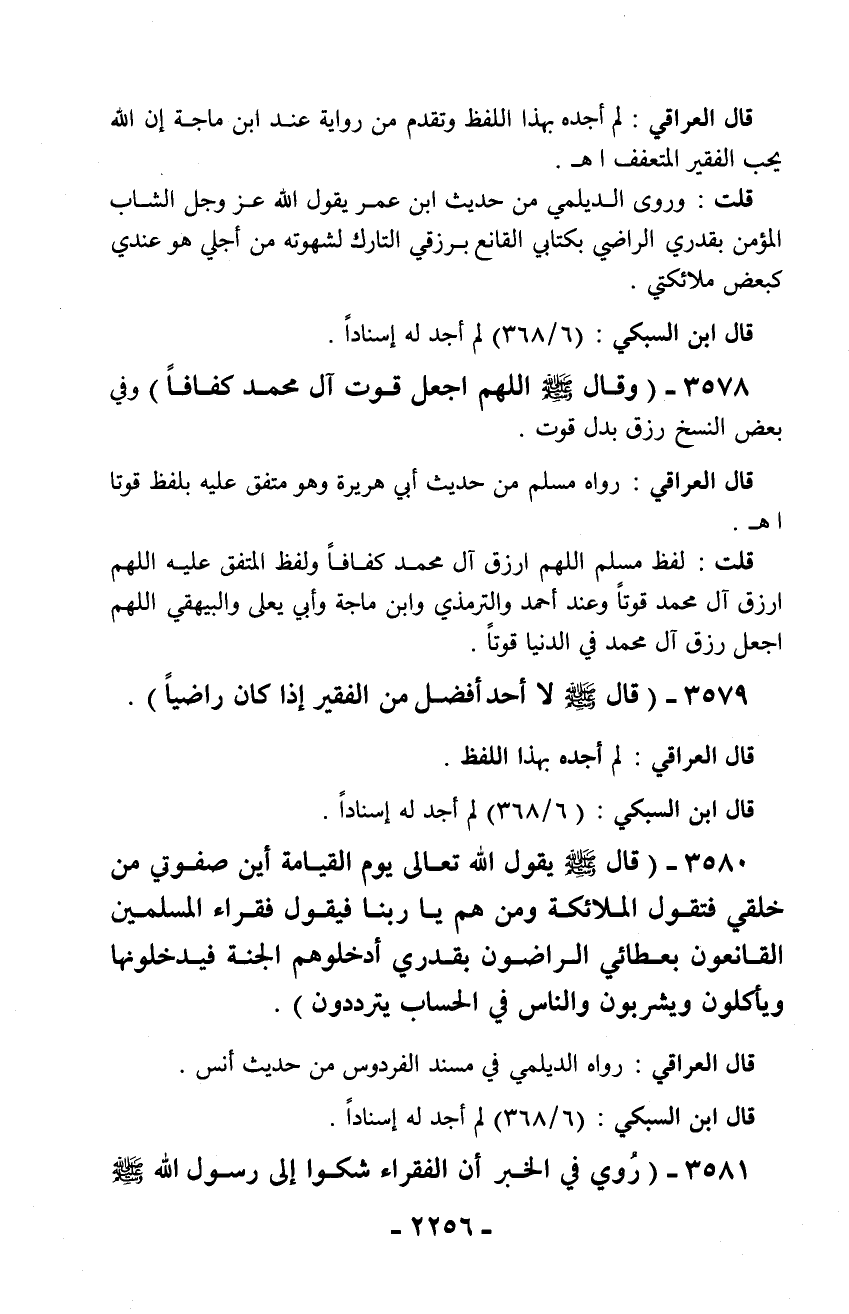 3578 - (وقال - صلّى الله عليه وسلم - اللهم اجعل قوت آل محمد كفافاً) وفي بعض النسخ رزق بدل قوت.